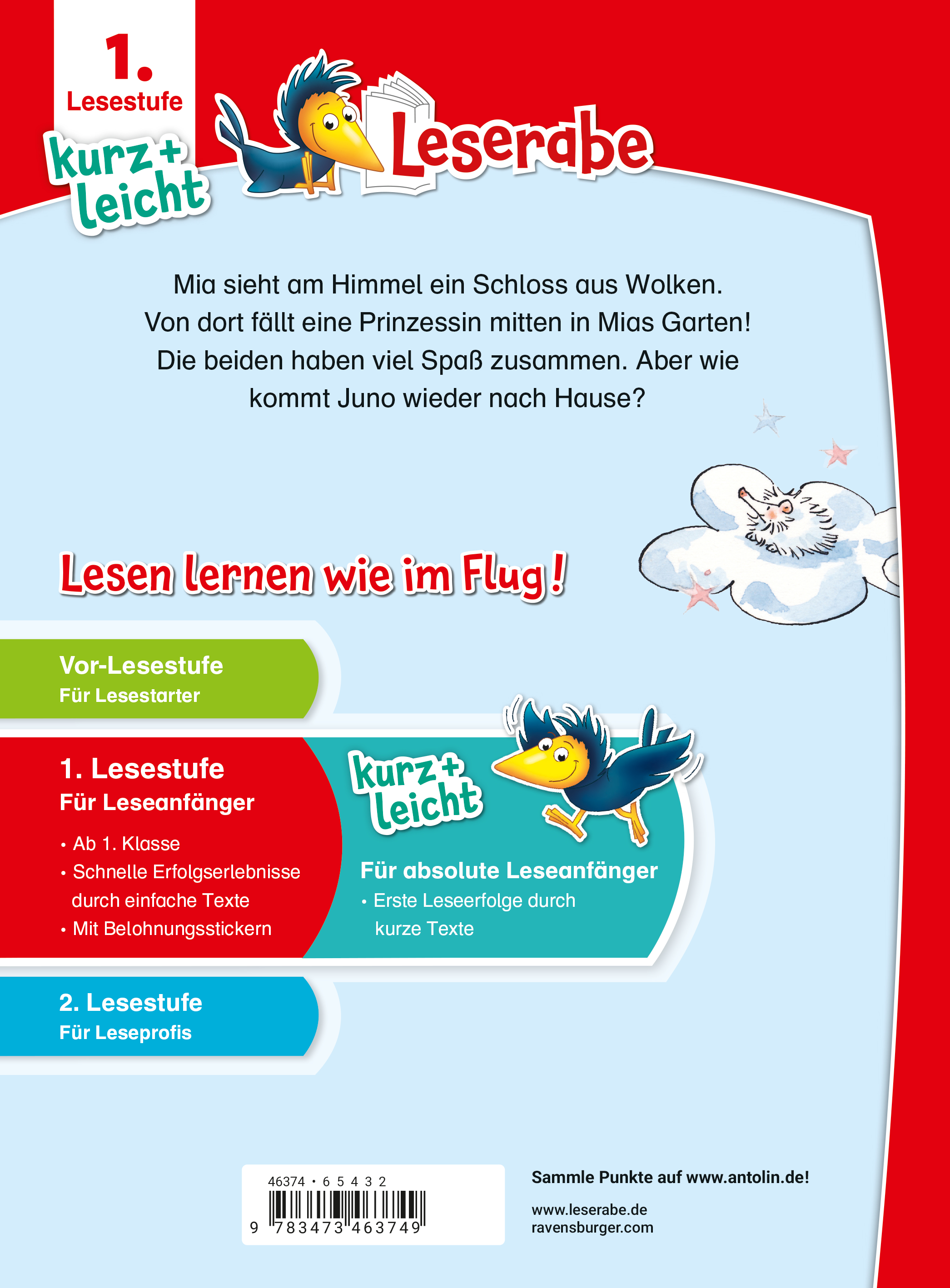 Lesen lernen wie im Flug! Mia sieht am Himmel eine Wolke, die wie ein Schloss aussieht. Da kommt ein Windstoß und es raschelt in Mias Apfelbaum. Eine echte Prinzessin ist darin gelandet. Doch wie soll die wieder in ihr Schloss aus Wolken gelangen? Gemeinsam müssen die beiden Mädchen die magische Flöte finden. Doch erst einmal nimmt Mia die Prinzessin mit nach Hause. Lesen lernen wie im Flug! Die Kinderbücher der Reihe "Leserabe – 1. Lesestufe – kurz + leicht" wurden mit Pädagogen entwickelt und richten sich an absolute Leseanfänger ab der 1. Klasse. Sie zeichnen sich durch besonders kurze Texte in großer Fibelschrift, wörtliche Rede in Sprechblasen und einen hohen Bildanteil aus. So steigern sie die Lesemotivation und Lesekompetenz von Mädchen und Jungen zu Beginn ihres Leselern-Prozesses. Mit Belohnungsstickern. Empfohlen von Stiftung Lesen, gelistet bei Antolin.
