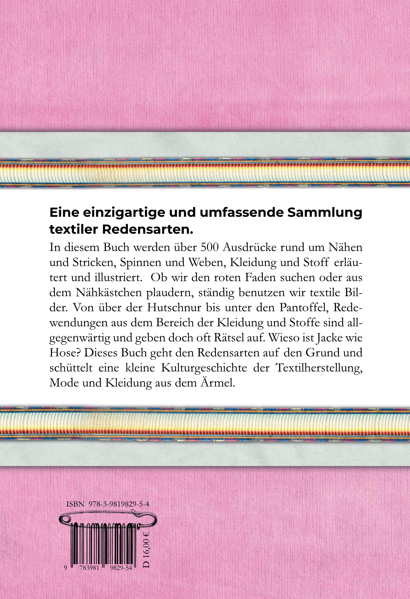 Über 500 Redensarten, in denen sich alles um Textilherstellung und Kleidung dreht. In dieser Neuausgabe fasst die Autorin Susanne Schnatmeyer die beiden Bücher "Verflixt und Zugenäht" und "Am Rockzipfel" zusammen und bereitet sie mit zahlreichen Illustrationen auf. Ob wir ins Garn gehen oder ins Netz, den roten Faden suchen und aus dem Nähkästchen plaudern, ständig benutzen wir Bilder aus dem Bereich der Textilherstellung. Wieso ist Jacke wie Hose? Wer nagt am Hungertuch und was haben Manschetten mit Muffensausen zu tun? Dieses Buch schüttelt eine kleine textile Kulturgeschichte aus dem Ärmel. Es macht Spaß, den Redewendungen auf den Grund zu gehen und dem heute fast vergessenen Wissen von Generationen nachzuspüren.