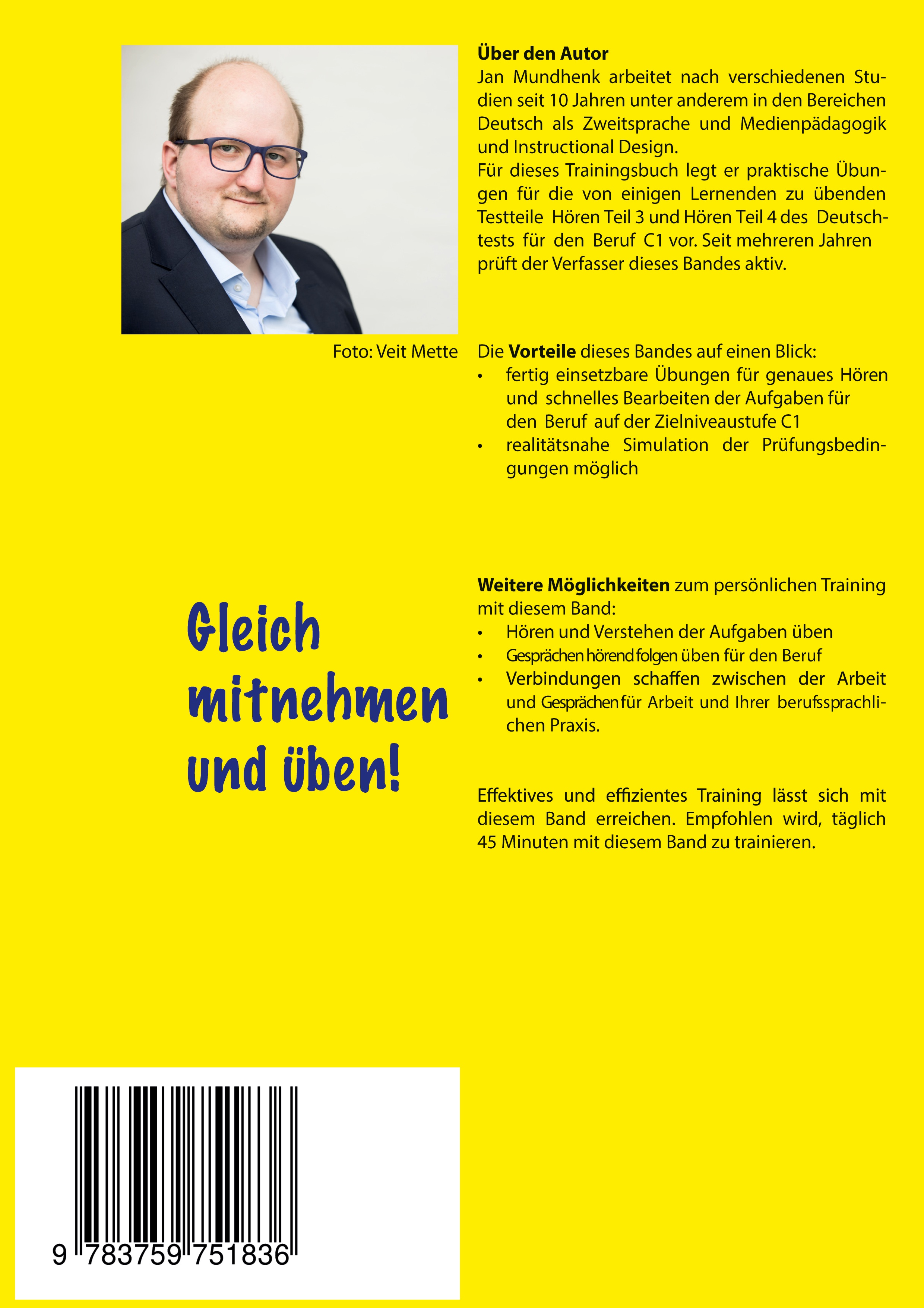 Jan Mundhenk arbeitet nach verschiedenen Studien seit 10 Jahren unter anderem in den Bereichen Deutsch als Zweitsprache und Medienpädagogik und Instructional Design. Für dieses Trainingsbuch legt er praktische Übungen für die von einigen Lernenden zu übenden Testteile Hören Teil 3 und Hören Teil 4 des Deutschtests für den Beruf C1 vor. Seit mehreren Jahren prüft der Verfasser dieses Bandes aktiv.