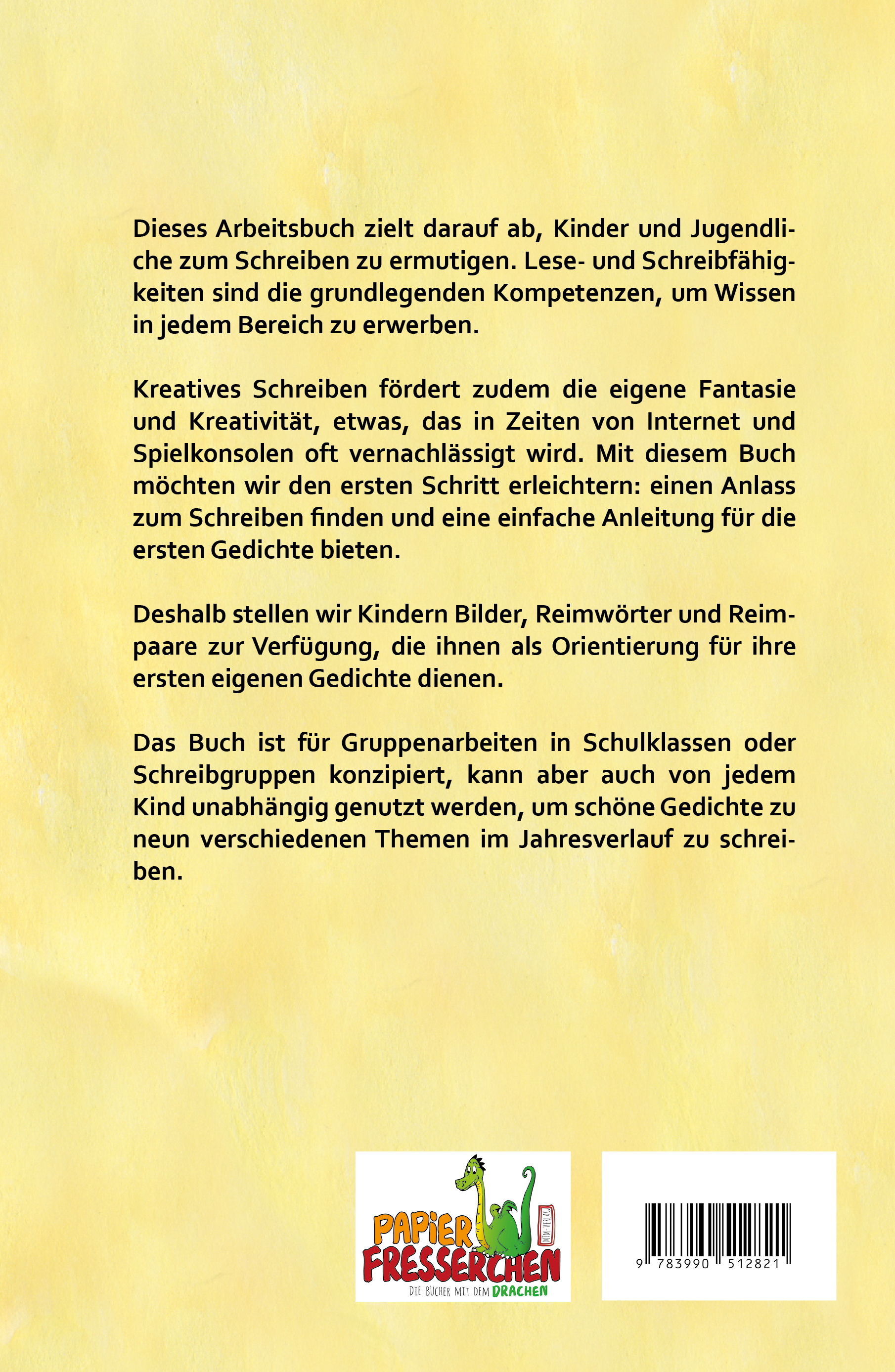 Kreatives Schreiben fördert zudem die eigene Fantasie und Kreativität, etwas, das in Zeiten von Internet und Spielkonsolen oft vernachlässigt wird. Mit diesem Buch möchten wir den ersten Schritt erleichtern: einen Anlass zum Schreiben finden und eine einfache Anleitung für die ersten Gedichte bieten.