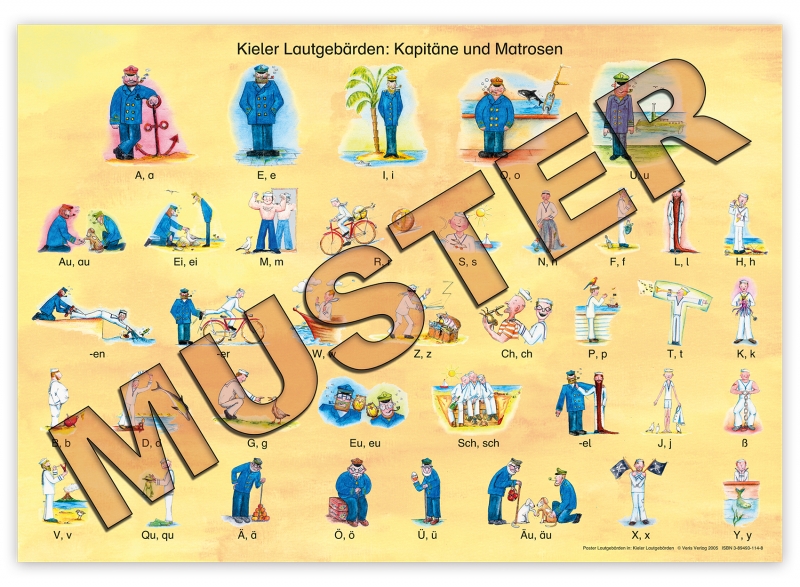 Die Kieler Lautgebärden unterstützen die Verbindung zwischen Lauten, Lautfolgen und Buchstaben in der Erinnerung des Kindes. Sie verankern das Gelernte über mehrere Kanäle (Sehen, Hören, Lesen, Sprechen, Bewegen) in beiden Gehirnhälften.Beim Schreiben muss ein Kind einen gehörten Laut in ein abstraktes Symbol, den Buchstaben verwandeln. Beim Lesen muss es umgekehrt den gelesenen Buchstaben in einen Laut übertragen.Buchstabenform und Laut werden durch die Lautgebärde mit einer Handbewegung bildhaft dargestellt. Das verbindet Laut und Buchstaben in der Erinnerung des Kindes fest miteinander.Nachdem die Lautgebärden der einzelnen Buchstaben beherrscht werden, folgt das Verschleifen von Konsonant und Vokal fast spielerisch. Das Kind "fühlt" den Rhythmus des Lesens und Schreibens und erkennt:Lesen und Schreiben folgt nicht dem Prinzip "Von Buchstabe zu Buchstabe" sondern "Von Silbe zu Silbe".In der deutschen Sprache braucht jede Silbe - also jedes Boot - mindestens einen Vokal: den Kapitän. Dieser Kapitän gibt den Ton an. Die meisten Silben haben darüber hinaus Mitfahrer, die Matrosen (Konsonanten).Alle Kapitäne und Matrosen werden einzeln mit leicht verständlicher Erklärung und Zeichnung zur Lautgebärde auf den Wandkarten abgebildet. Auf dem Plakat werden Sie gemeinsam vorgestellt.Mit enthalten sind auch Wandkarten mit Ä, Ö, Ü, AU, EI, CH, SCH, ÄU, EU sowie die Endungen -er und -el.Je nach Unterrichtssituation können die Lautgebärden stehend oder auch am Tisch sitzend ausgeführt werden. Lassen Sie die Kinder entscheiden, welche Hand sie zum Zeigen der Lautgebärde benutzen möchten. Die Praxis zeigt, dass sich daraus kein Nachteil für den Leseerwerb ergibt.Bei der Einführung kann man viele Kinder zusätzlich motivieren, wenn man die Lautgebärden "Geheimzeichen" nennt.Das kindgerechte Material wird mit viel Freude angenommen. Die Verbindung von Buchstaben, Lauten und Gebärden mit den fröhlichen Illustrationen fördern den Leselernprozess: Die Grafiken freuen die Kinder und entspannt wird das Lernen leichter. Sie verknüpfen Bilder, Geschichten und Gefühle mit Hilfe der Figuren und damit auch mit den Buchstaben, Lauten und Lautgebärden. Der Stoff wird plastischer.Die Kieler Lautgebärden entstammen dem Kieler Leseaufbau, ein lautgetreuer Leselehrgang, der konsequent dem heilpädagogischen Grundsatz "Vom Einfachen zum Schwierigen" folgt. Die Lautgebärden werden im Handbuch erläutert.Das Material kann unabhängig von der Arbeit mit dem Kieler Leseaufbau eingesetzt werden.Die Karten und das Poster sind Ideal zum Aufhängen im Klassenraum.
