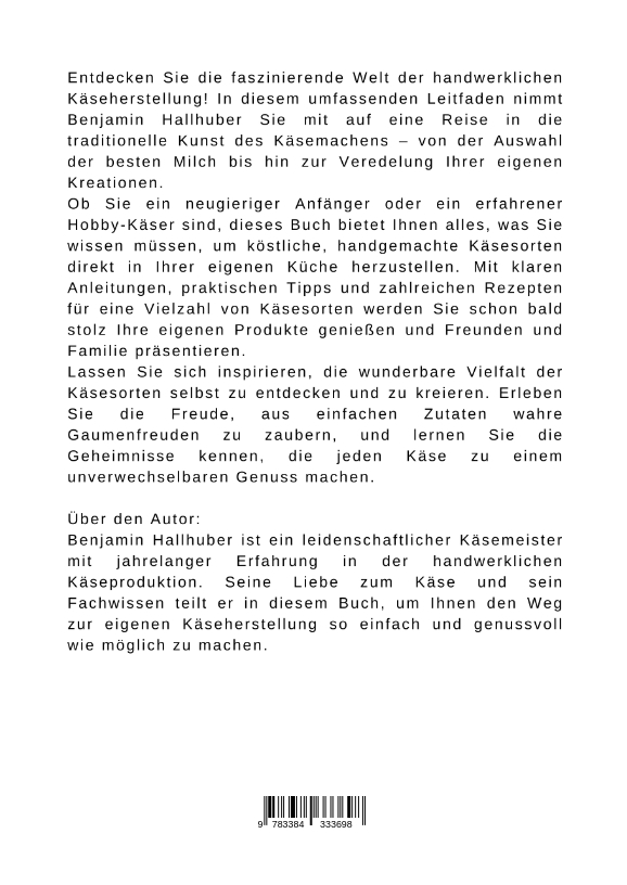 Benjamin Hallhuber ist ein leidenschaftlicher Käsemeister mit jahrelanger Erfahrung in der handwerklichen Käseproduktion. Seine Liebe zum Käse und sein Fachwissen teilt er in diesem Buch, um Ihnen den Weg zur eigenen Käseherstellung so einfach und genussvoll wie möglich zu machen.