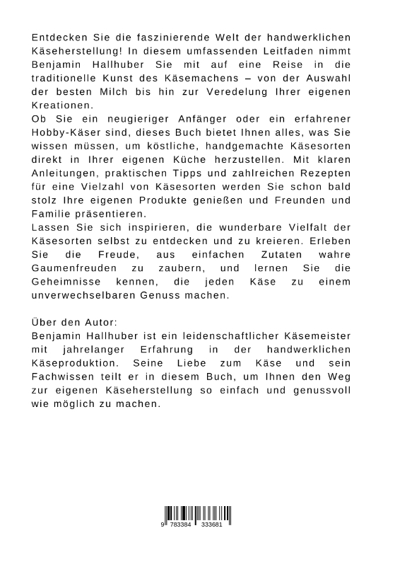 Benjamin Hallhuber ist ein leidenschaftlicher Käsemeister mit jahrelanger Erfahrung in der handwerklichen Käseproduktion. Seine Liebe zum Käse und sein Fachwissen teilt er in diesem Buch, um Ihnen den Weg zur eigenen Käseherstellung so einfach und genussvoll wie möglich zu machen.