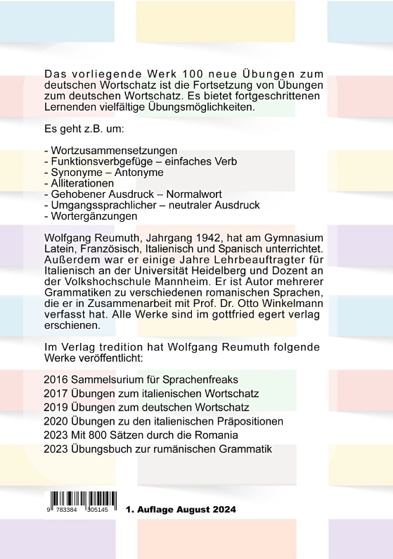 Wolfgang Reumuth, Jahrgang 1942, hat 35 Jahre Latein, Französisch, Italienisch und Spanisch am Gymnasium unterrichtet. Außerdem war er einige Jahre Lehrbeauftragter für Italienisch an der Universität Heidelberg und Dozent an der Volkshochschule Mannheim. Seit 2006 ist er in Pension. Er ist Autor mehrerer Grammatiken zu verschiedenen romanischen Sprachen, die er in Zusammenarbeit mit Prof. Dr. Otto Winkelmann verfasst hat. Außerdem hat er Übungsbücher zu diesen Grammatiken veröffentlicht. Alle Werke sind im gottfried egert verlag erschienen. Liste der Veröffentlichungen: 1. Praktische Grammatik der italienischen Sprache (8. Auflage, 2016) 2. Praktische Grammatik der spanischen Sprache (6. Auflage, 2011) 3. Praktische Grammatik der französischen Sprache (2. Auflage, 2005) 4. Praktische Grammatik der portugiesischen Sprache (2013) All diese Grammatiken sind in Zusammenarbeit mit Prof. Dr. Otto Winkelmann, Universität Gießen, entstanden. 5. Praktische Grammatik der neugriechischen Sprache (2014, in Zusammenarbeit mit Vasileios Militsis) An der Praktische(n) Grammatik der englischen Sprache von Matthias Hutz und Kathryn Khairi-Taraki (2008) hat er mitgearbeitet. 6. Übungsbuch zur italienischen Grammatik (3. Auflage, 2005) 7. Übungsbuch zur spanischen Grammatik (2. Auflage, 2012) 8. Übungsbuch zur französischen Grammatik (2. Auflage, 2010, zusammen mit Anne Boisson, Universität Gießen) 9. Unterrichtssprache Deutsch-Italienisch (1994, zusammen mit Maria Grazia Chiaro, Übersetzerin) 10. Unterrichtssprache Deutsch-Französisch (1995, zusammen mit Anne Boisson).