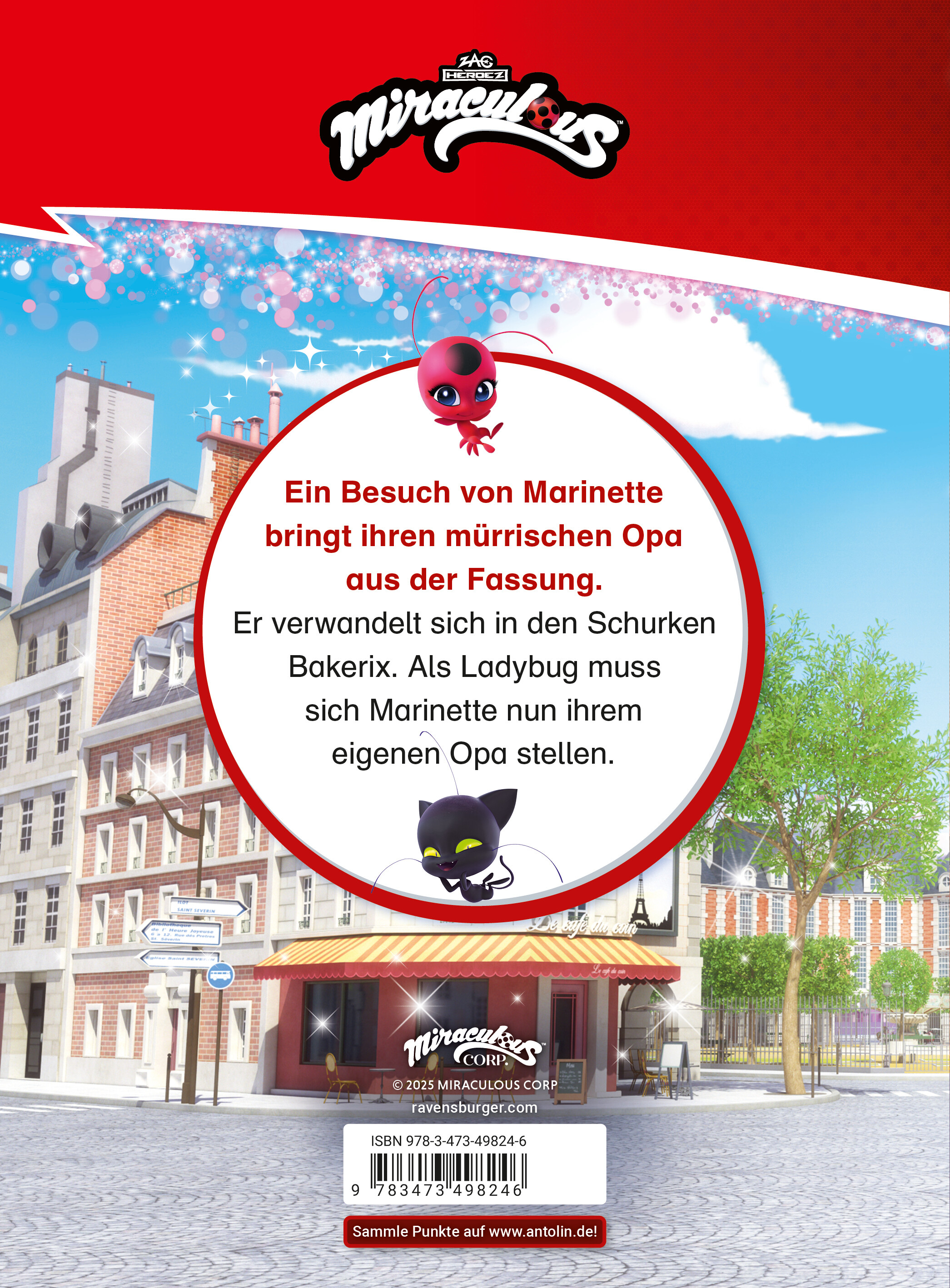 Lesen lernen mit den Lieblingshelden Ladybug und Cat Noir: Mit Miraculous macht lesen Spaß! Marinette besucht ihren mürrischen Opa. Er hat sein Haus seit vielen Jahren nicht verlassen und verabscheut alles, was ihm zu modern erscheint. Als er herausfindet, was es mit Marinettes Besuch auf sich hat, verwandelt er sich in den Schurken Bakerix. Sein Ziel: eine alte Version von Paris wiederherstellen und dafür alles Moderne zerstören. Als Ladybug muss sich Marinette nun ihrem eigenen Opa stellen. Dieses Erstlesebuch zu einer der beliebtesten Serien im TV und Streaming bringt die Spannung und Abenteuer von Miraculous auch abseits des Bildschirms ins eigene Zuhause. In einfachen Sätzen und kurzen Kapiteln mit vielen Bildern wird eine ganze Folge der Serie für Kinder ab 7 Jahre nacherzählt. Seite für Seite lesen sie die Geschichte selbst und werden Wort für Wort zum Leseprofi. Die Quizfragen am Ende jedes Kapitels machen Spaß und prüfen ganz nebenbei das Textverständnis. Mit Ladybug und Cat Noir die Welt retten und nebenbei lesen üben. So cool können Bücher sein!