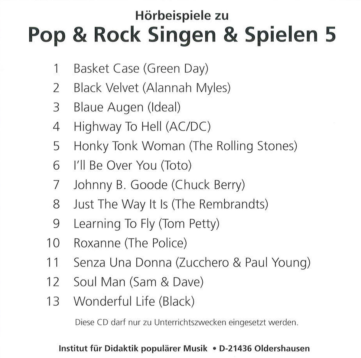 | Schlagworte | (AC/DC) • Audio-CD • AUDIO/Medizin • AUDIO/Schule, Lernen/Schulbücher Allgemeinbildende Schulen • AUDIO/Schule, Lernen/Unterrichtsvorbereitung/Unterrichtsmaterialien, Handreichun • Basket Case • blaue Augen • Greenday • Highway to Hell • Honky Tonk Woman • Ideal • I’ll Be over You • Johnny B • Just the Way It Is • Lernen • Police • Roxanne • Sam & Dave • Schule • Senza Una Donna • Soulman • The Rembrandts • The Rolling Stones • Toto • Unterrichtsvorbereitung • Young • Zucchero & Paul |