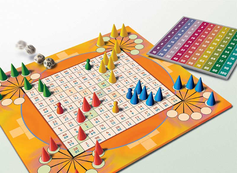 Auf dem Spielbrett sind die Multiplikationsprodukte des kleinen Einmaleins verteilt. Der Würfel legt die zu rechnende Reihe fest, für die nun rund um die eigene Spielfigur ein Reihenprodukt gesucht wird. Das Ergebnis der Divisionsaufgabe gibt vor, wie viele Bewegungen mit den eigenen Hütchen pro Spielzug gemacht werden dürfen.