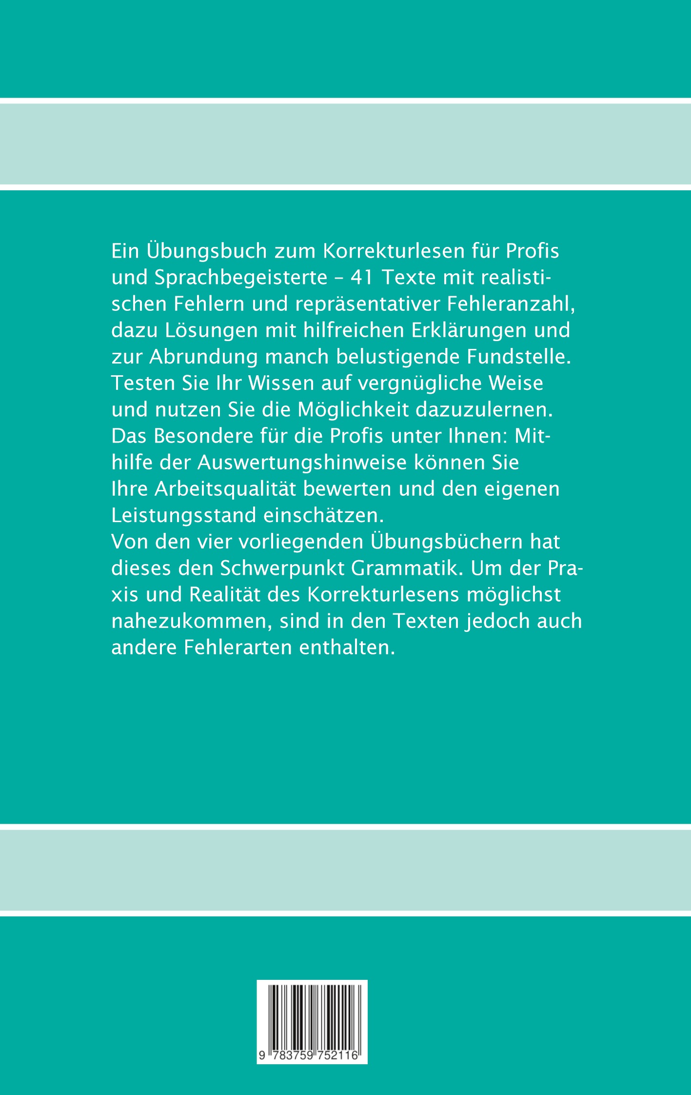 Von den vier vorliegenden Übungsbüchern hat dieses den Schwerpunkt Grammatik. Um der Praxis und Realität des Korrekturlesens möglichst nahezukommen, sind in den Texten jedoch auch andere Fehlerarten enthalten.
