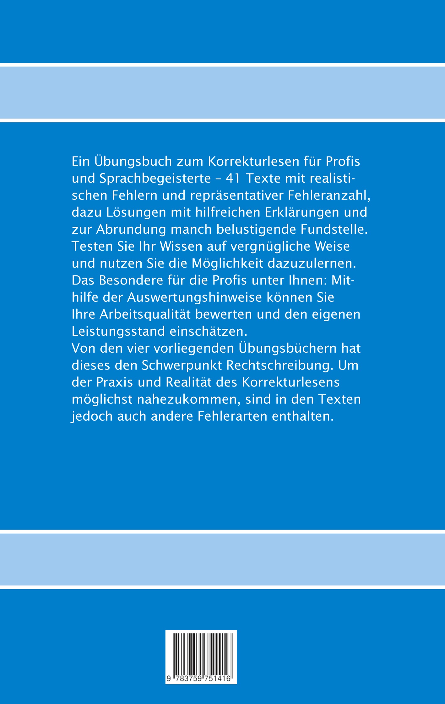 Von den vier vorliegenden Übungsbüchern hat dieses den Schwerpunkt Rechtschreibung. Um der Praxis und Realität des Korrekturlesens möglichst nahezukommen, sind in den Texten jedoch auch andere Fehlerarten enthalten.