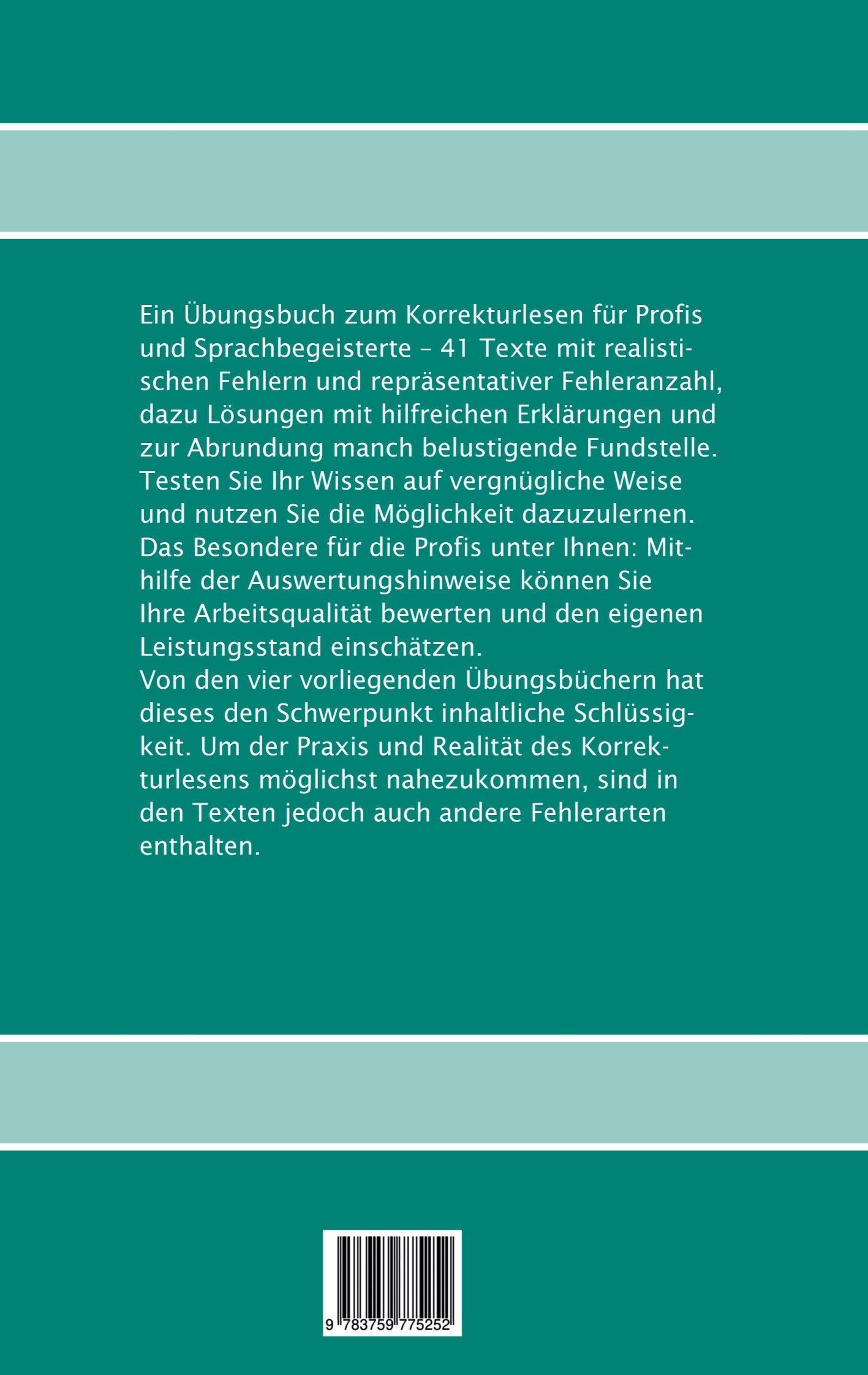 Von den vier vorliegenden Übungsbüchern hat dieses den Schwerpunkt inhaltliche Schlüssigkeit. Um der Praxis und Realität des Korrekturlesens möglichst nahezukommen, sind in den Texten jedoch auch andere Fehlerarten enthalten.