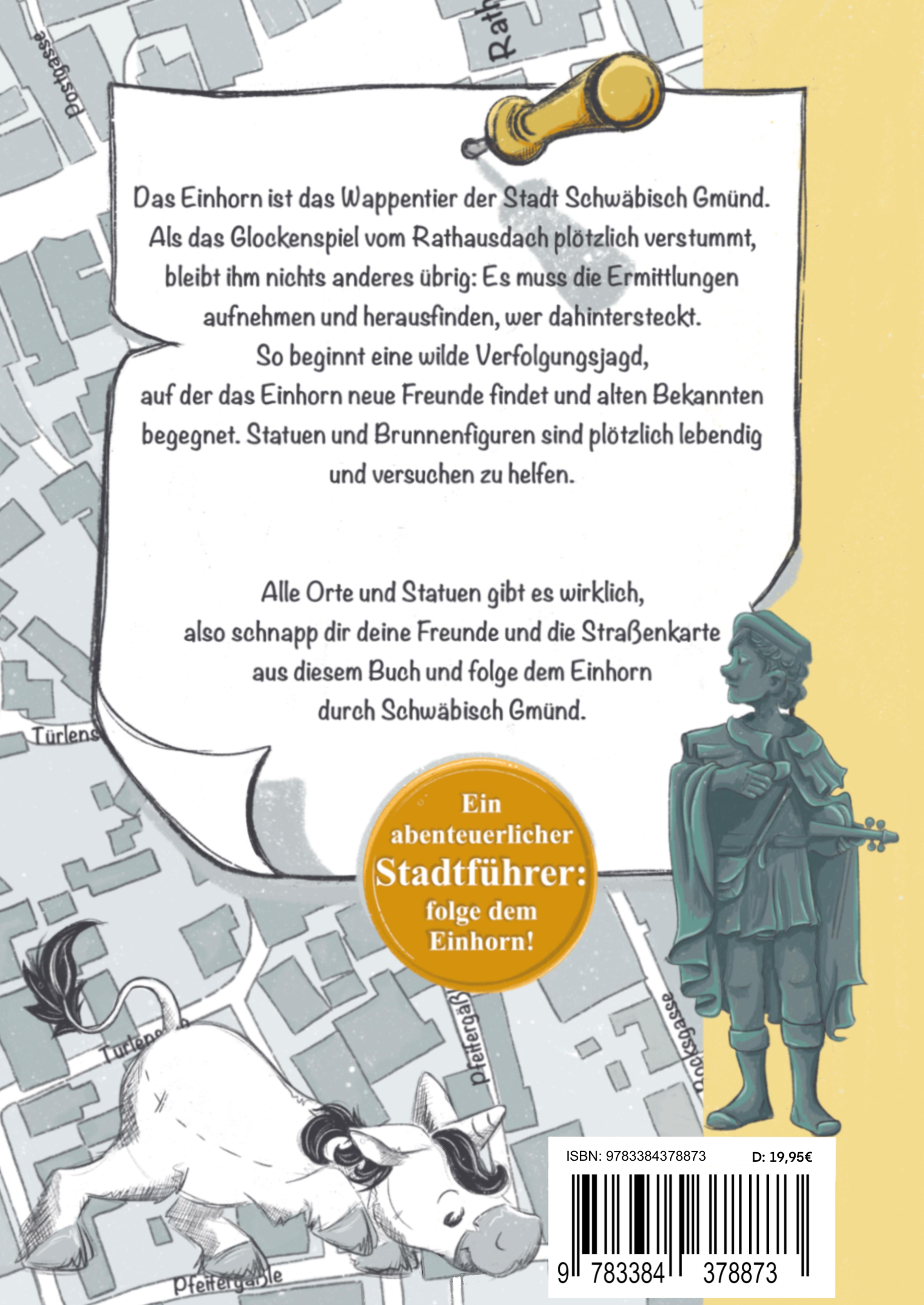 Das Einhorn ist das Wappentier der Stadt Schwäbisch Gmünd. Als das Glockenspiel auf dem Rathausdach plötzlich verstummt, bleibt ihm nichts anderes übrig: Es muss die Ermittlungen aufnehmen und herausfinden, wer dahintersteckt. So beginnt eine wilde Verfolgungsjagd, auf der das Einhorn neue Freunde findet und alten Bekannten begegnet. Statuen und Brunnenfiguren sind plötzlich lebendig und versuchen zu helfen.Alle Orte und Statuen gibt es wirklich, also schnapp dir deine Freunde und die Straßenkarte aus diesem Buch und folge dem Einhorn durch Schwäbisch Gmünd.