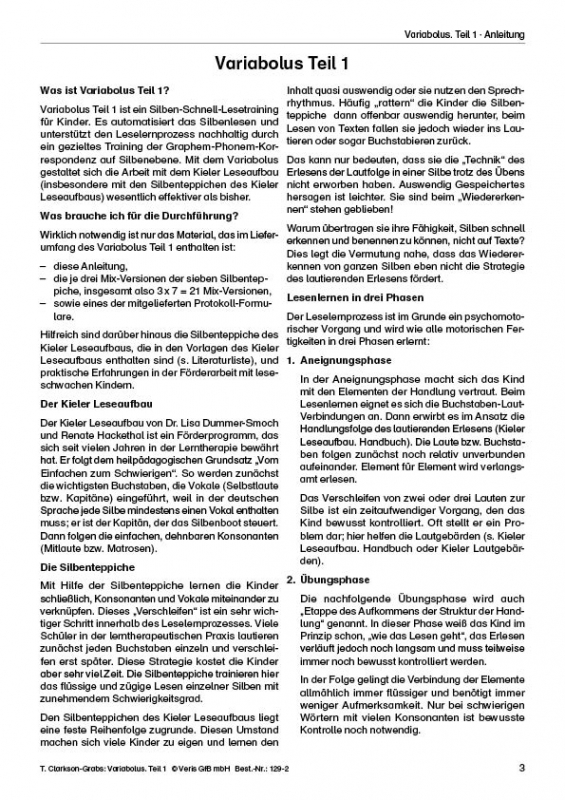 Das Silben-Schnell-Lesetraining automatisiert das Silbenlesen und unterstützt den Leselernprozess nachhaltig durch ein gezieltes Training der Graphem-Phonem-Korrespondenz.Mit Hilfe der Silbenteppiche aus dem Kieler Leseaufbau lernen die Kinder, Konsonanten und Vokale in der Aussprache sauber miteinander zu verbinden. Dieses "Verschleifen" ist ein sehr wichtiger Schritt innerhalb des Leselernprozesses. Viele Kinder lautieren zunächst jeden Buchstaben einzeln und verschleifen erst später. Diese Strategie kostet die Kinder viel Kraft.Die Silbenteppiche trainieren das flüssige Lesen einzelner Silben mit zunehmenden Schwierigkeitsgrad.Da den Silbenteppichen des Kieler Leseaufbaus eine feste Reihenfolge zugrunde liegt, lernen manche Kinder den Inhalt quasi auswendig und/oder nutzen den Sprechrhythmus zur Erleichterung.Hier setzt Variabolus Teil 1 an:Es automatisiert das Silbenlesen und verhindert auswendiges "herunterrattern"!Zu den Silbenteppichen wurden jeweils drei Silbenmix-Versionen erstellt:Der erste Mix behält die Reihenfolge der Konsonanten bei (z.B. Silbenteppich 1: M, R, S, N, F, L, H, W, Z, CH), mischt aber innerhalb jeder Zeile die Reihenfolge der Vokale:MO MER MA MI MEN MU ME MEI MAUstattMA ME MI MO MU MAU MEI MEN MERZu jedem Silbenteppich gibt es noch zwei weitere Mix-Versionen, in denen alle Silben gemischt vorgegeben werden.So muss sich das Kind jede Silbenreihe wirklich "erlesen" und so erreichen wir die Automatisierung des Lesevorgangs auf Silbenebene - auch bei Kindern mit Einschränkungen in den Sprachwahrnehmungsleistungen.Die beiliegenden Protokollbögen (Lernerfolgsmessung) zeigen dem Kind seine Fortschritte auf. Es sieht seine Erfolge deutlich vor sich, auf einem Gebiet, das emotional vorher häufig mit Misserfolgserlebnissen verbunden war. Dieser Anreiz zur Leistungssteigerung hat sich in der Praxis als starke Triebfeder herausgestellt.Das Silben-Schnell-Lesetraining Variabolus Teil 1 enthält eine ausführliche Anleitung und 25 Protokollbögen.Es kann separat oder ergänzend zum Kieler Leseaufbau eingesetzt werden.Für das Material besteht Kopierverbot.