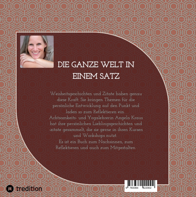 Die ganze Welt in einem Satz. Weisheitsgeschichten und Zitate haben genau diese Kraft: Sie bringen Themen für die persönliche Entwicklung auf den Punkt und laden so zum Reflektieren ein. Achtsamkeits- und Yogalehrerin Angela Kraus hat ihre persönlichen Lieblingsgeschichten und -zitate gesammelt, die sie gerne in ihren Kursen und Workshops nutzt. Es ist ein Buch zum Nachsinnen, zum Reflektieren und auch zum Mitgestalten.Im ersten Teil des Buches finden sich 30 ausgewählte Weisheitsgeschichten. Manche sind nur ein paar Sätze lang, andere mehrere Seiten. Die Geschichten sind teilweise mit Bleistiftzeichnungen (Marie Schwarzer) illustriert. Im zweiten Teil des Buches warten 30 ausgewählte Zitate auf die Leser*in. Hier kann persönlich mitgestaltet werden, da jedes Zitat für sich alleine steht und es jeweils einen extra Raum für eigene Gedanken gibt. Es kann auch etwas eingeklebt oder gezeichnet werden. So wird dieses kleine Buch zu einem ganz persönlichen Begleiter. Aufgeschlagen in einem Buchständer platziert stellt es eine liebevolle Erinnerung im Alltag dar.