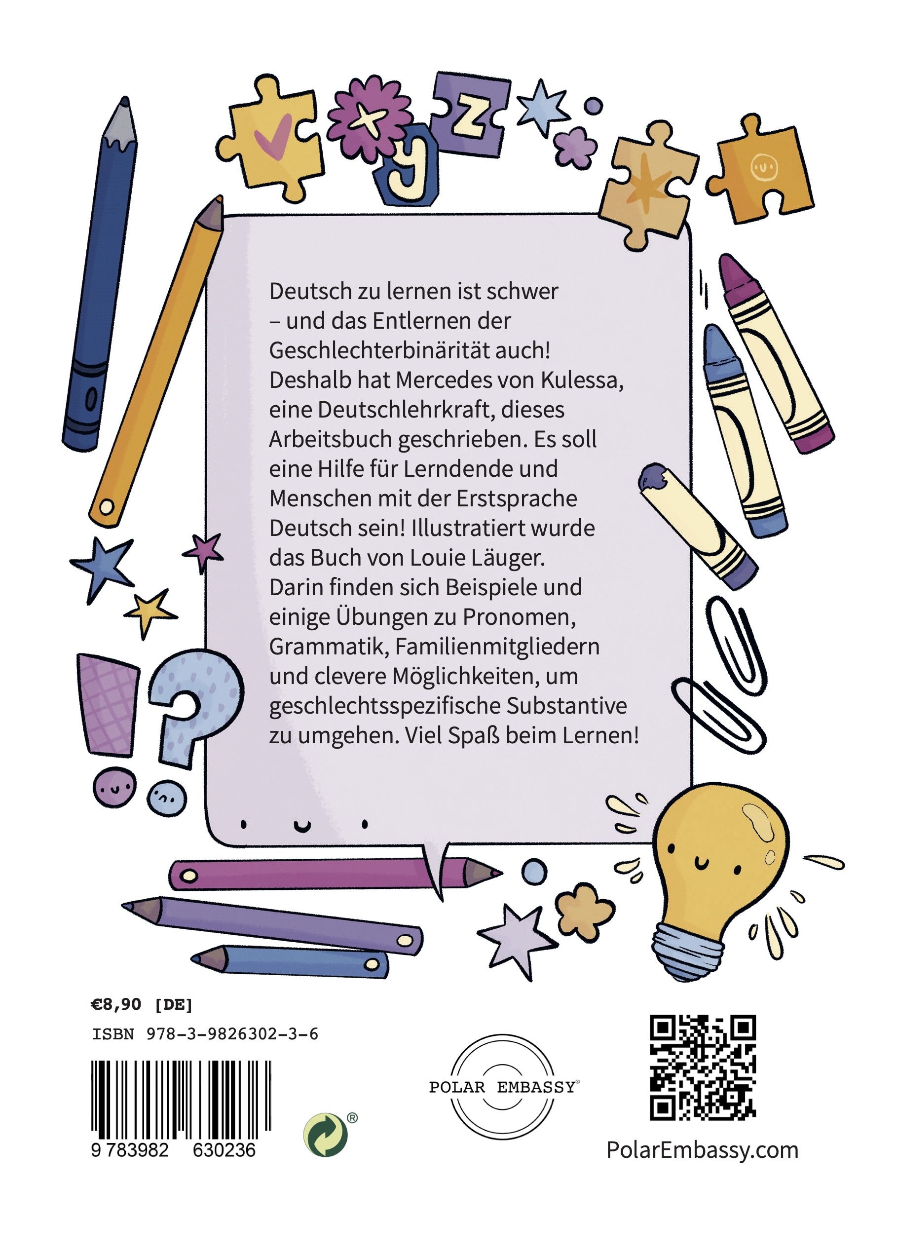 Deshalb hat Mercedes von Kulessa, eine Deutschlehrkraft, dieses Arbeitsbuch geschrieben. Es soll eine Hilfe für Lerndende und Menschen mit der Erstsprache Deutsch sein! Illustratiert wurde das Buch von Louie Läuger.
