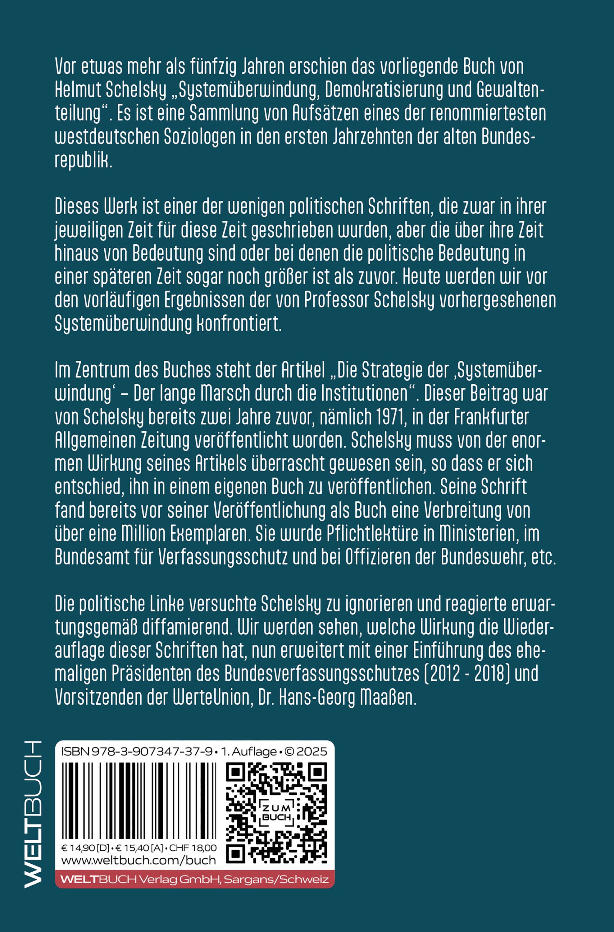 Die politische Linke versuchte Schelsky zu ignorieren und reagierte erwartungsgemäß diffamierend. Wir werden sehen, welche Wirkung die Wiederauflage dieser Schriften hat, nun erweitert mit einer Einführung des ehemaligen Präsidenten des Bundesverfassungsschutzes (2012 - 2018) und Vorsitzenden der WerteUnion, Dr. Hans-Georg Maaßen. Inhalt