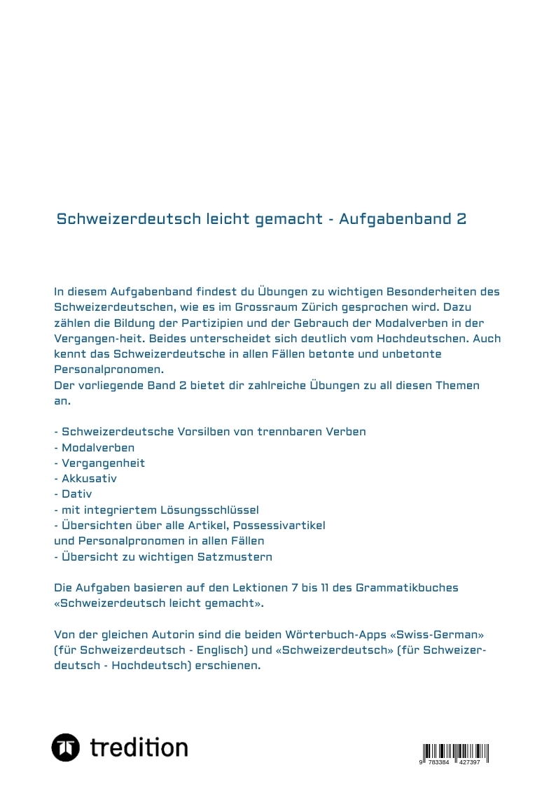 | Schlagworte | Aufgabenband • Dialekt • Erwachsene • Erwachsenenbildung • Lehrmittel • Schweizerdeutsch • Schwiizerdüütsch • Selbststudium • Sprachübungen • Zürich |