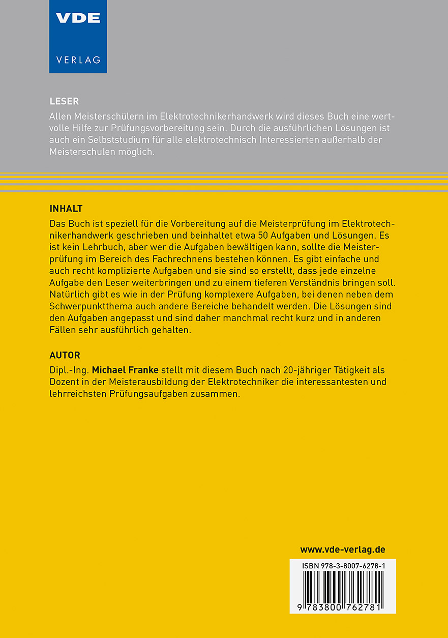 Dipl.-Ing. Michael Franke stellt mit diesem Buch nach 20-jähriger Tätigkeit als Dozent in der Meisterausbildung der Elektrotechniker die interessantesten und lehrreichsten Prüfungsaufgaben zusammen.