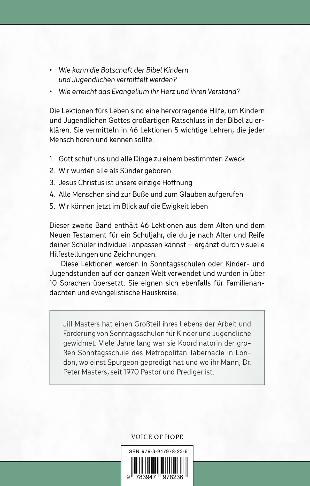 Dieser zweite Band enthält 46 Lektionen aus dem Alten und dem Neuen Testament für ein Schuljahr, die du je nach Alter und Reife deiner Schüler individuell anpassen kannst – ergänzt durch visuelle Hilfestellungen und Zeichnungen. Diese Lektionen werden in Sonntagsschulen oder Kinder- und Jugendstunden auf der ganzen Welt verwendet und wurden in über 10 Sprachen übersetzt. Sie eignen sich ebenfalls für Familienandachten und evangelistische Hauskreise.