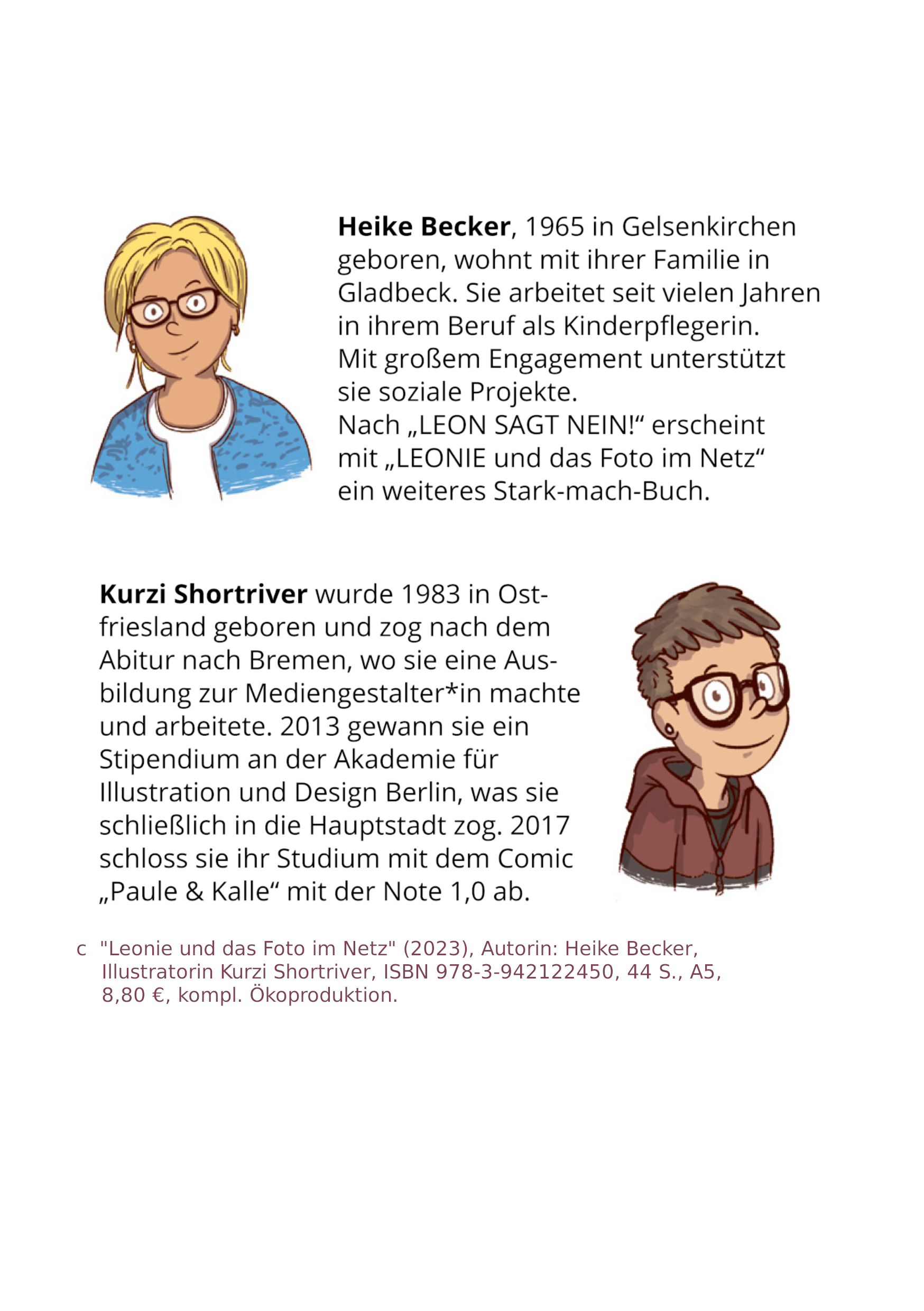 Heike Becker, 1965 in Gelsenkirchen geboren, wohnt mit ihrer Familie in Gladbeck. Sie arbeitet seit vielen Jahren in ihrem Beruf als Kinderpflegerin. Mit großem Engagement unterstützt sie soziale Projekte. Nach "Leon sagt NEIN!" und "Leonie und das Foto im Netz" erscheint nun mit "Luis kann (noch) nicht lesen" ein weiteres Stark-mach-Buch für Grundschulkinder.