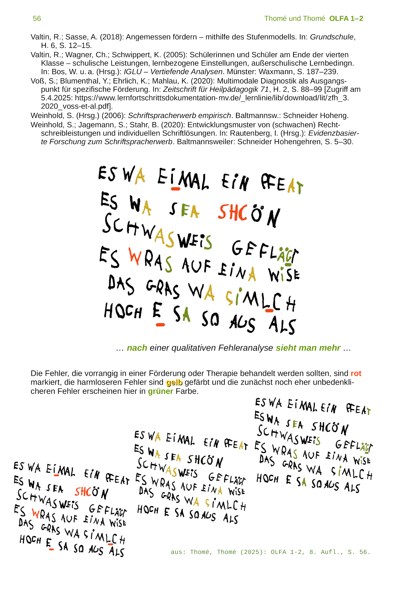 "Die pädagogischen und fachdidaktischen Vorteile von OLFA sind (vgl. Thomé und Thomé 2009) in den folgenden Punkten zusammengefasst: 'echte Förderdiagnostik' ..., Flexibilität des Einsatzes ..., keine Testsituation ... Motivationsförderung'." (A. Sasse und R. Valtin (2014): Rechtschreibdiagnose für freie Texte. Die Anwendung der Oldenburger Fehleranalyse (OLFA). In "Deutsch differenziert 4/2014, S. 19)