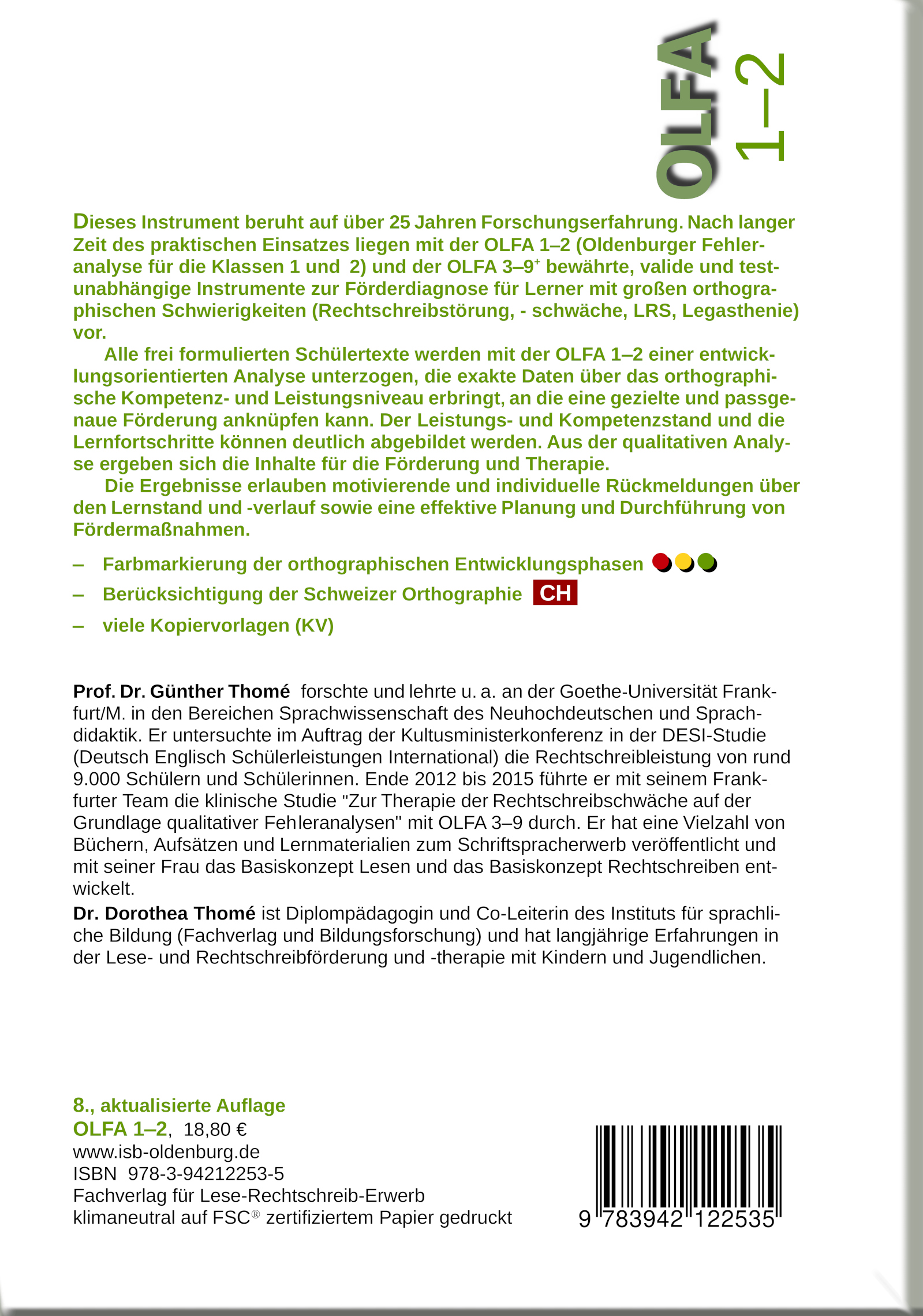 REZENSIONSZITAT "Mit der OLFA 1-2 lässt sich auf Basis freier Texte eine sehr differenzierte Fehleranalyse durchführen. (...) Die OLFA 1-2 ist ein gut durchdachtes, informatives Instrument, das ein wenig Einarbeitung benötigt, dann aber eine sehr differenzierte Fehleranalyse bietet." (Rainer Mohr, Legasthenietherapie-info.de, Newsletter 02/2019) REZENSIONSZITAT (bezieht sich auf eine Vorgängerauflage) "Die pädagogischen und fachdidaktischen Vorteile von OLFA sind (vgl. Thomé und Thomé 2009) in den folgenden Punkten zusammengefasst: 'echte Förderdiagnostik' ..., Flexibilität des Einsatzes ..., keine Testsituation ... Motivationsförderung'." (A. Sasse und R. Valtin (2014): Rechtschreibdiagnose für freie Texte. Die Anwendung der Oldenburger Fehleranalyse (OLFA). In "Deutsch differenziert 4/2014, S. 19) "Thomé und Thomé ist es gelungen, eine durchdachte qualitative Fehleranalyse für Schüler der ersten und zweiten Klasse zu konstruieren. Insbesondere die Möglichkeit des Berechnens der einzelnen Kennwerte kann sehr überzeugen. (.) Insgesamt handelt es sich bei der OLFA 1-2 um ein sehr gelungenes Diagnoseinstrument für die qualitative Fehleranalyse." (Dipl.-Psych. Rainer Mohr, Journal für Legasthenietherapie, Ausgabe 4/2014)