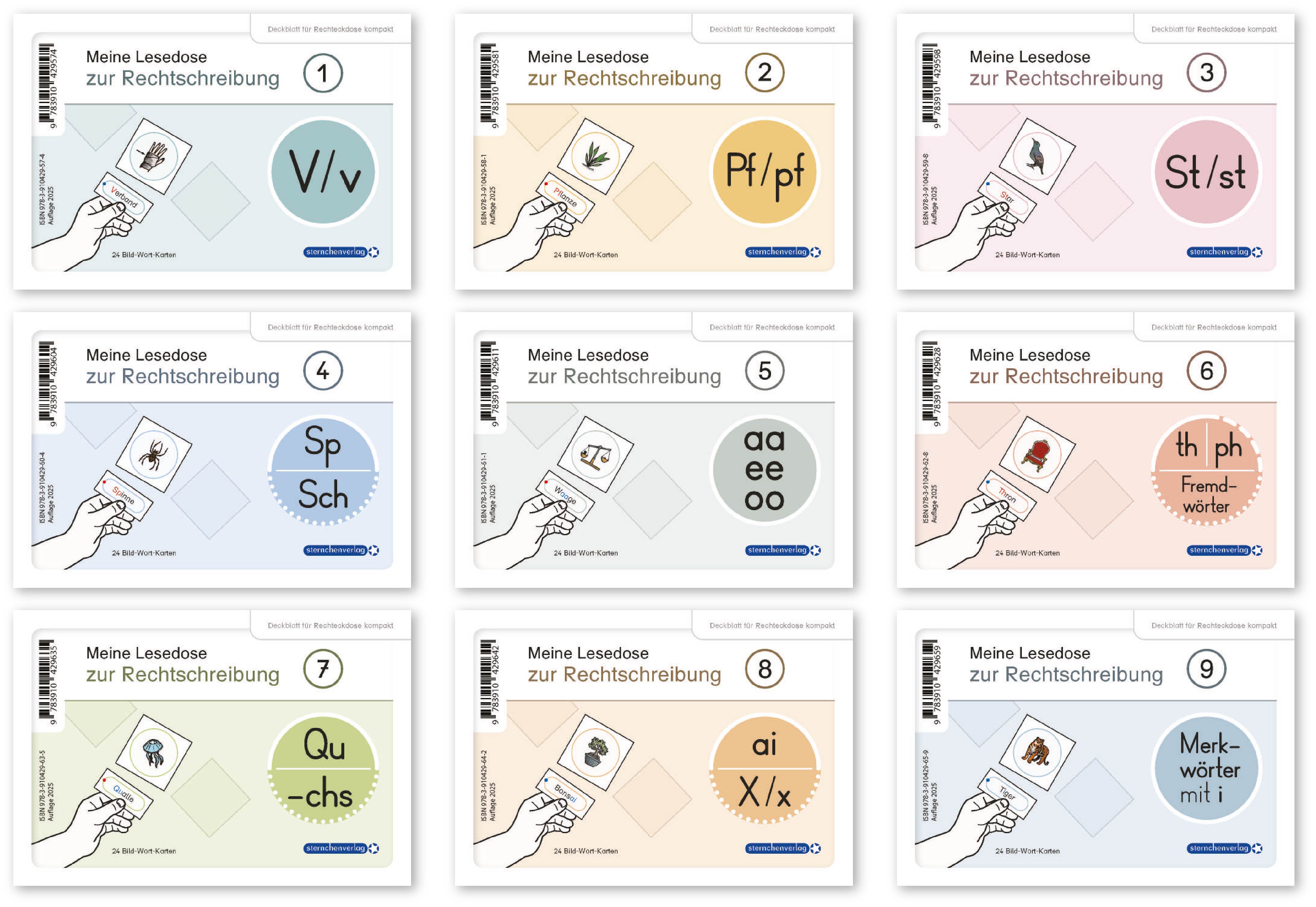 9 Lesedosen mit jeweils 24 Bild-Wort-Karten in Sprechsilben zum selbstständigen Arbeiten mit farbiger Artikelkennzeichnung und rückseitiger Selbstkontrolle.Die Wort-Bild-Karten in Sprechsilben befinden sich jeweils in Pappschachteln.Lieferumfang:Meine Lesedose zur Rechtschreibung 1 - V/v - WörterMeine Lesedose zur Rechtschreibung 2 - PF/pf - WörterMeine Lesedose zur Rechtschreibung 3 - St/st - WörterMeine Lesedose zur Rechtschreibung 4 - Sp/sp- und Sch/sch - Wörter Meine Lesedose zur Rechtschreibung 5 - aa-, ee- und oo - WörterMeine Lesedose zur Rechtschreibung 6 - TH/th, Ph/ph- und FremdwörterMeine Lesedose zur Rechtschreibung 7 - Qu/qu- und chs- WörterMeine Lesedose zur Rechtschreibung 8 - ai- und X/x - WörterMeine Lesedose zur Rechtschreibung 9 - Merkwörter mit i
