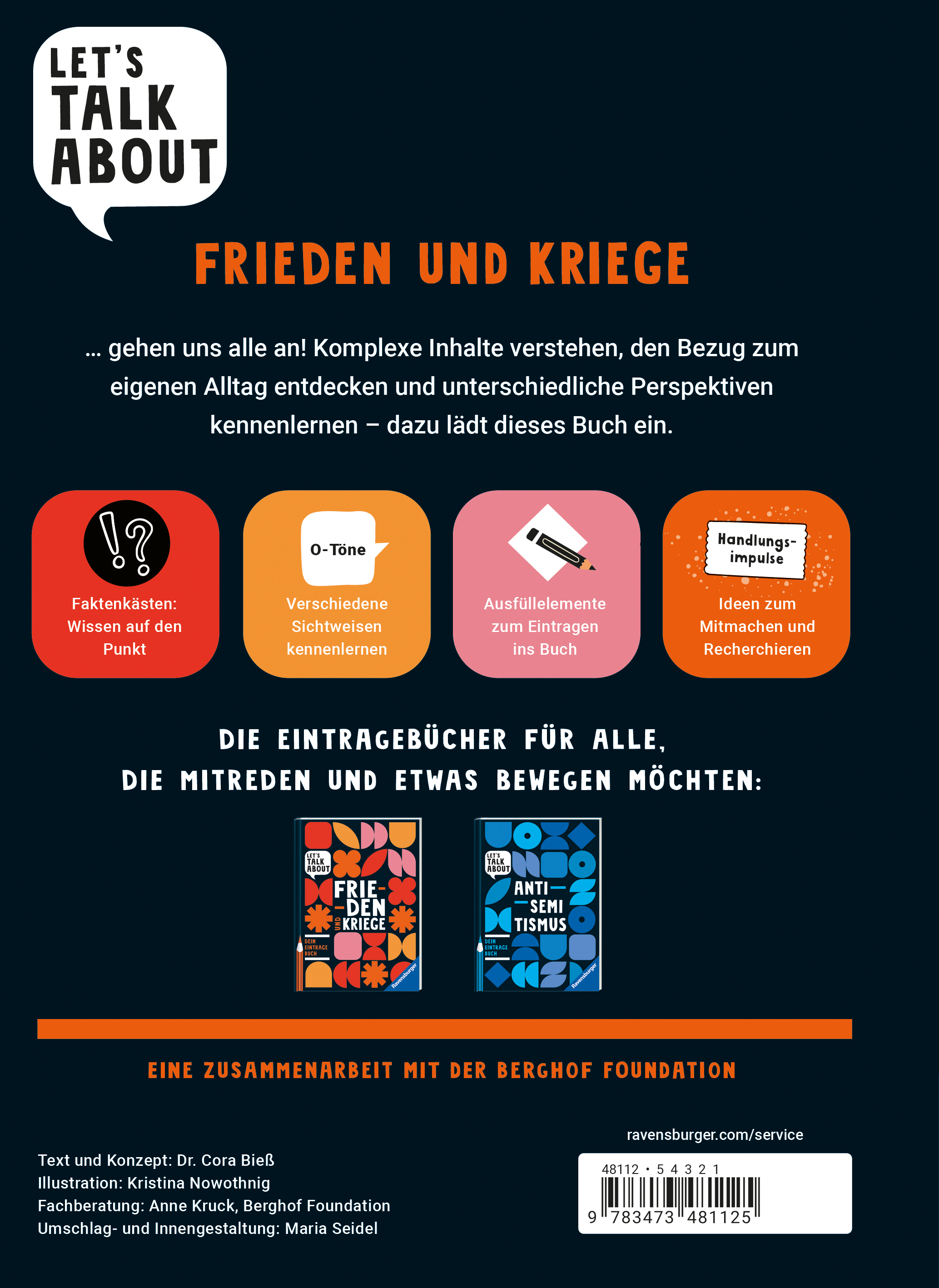 | Schlagworte | Aktivismus • aktiv werden • Ausgrenzung • Beschäftigung • Buch • Bücher • Eintragebuch • Flucht • Frieden • für Jungen • für Kinder ab 12 Jahre • für Mädchen • Geflüchtete • Geschenk • Geschenkidee • Gewalt • Jugendliche • Kinderbuch • Kinderbücher • Kindersachbuch • Kriegsberichterstattung • Lesen • Militär • Politik • Sachbuch • Sachbücher • Streitkultur • Streit schlichten • Umgang mit Konflikten • Verständigung • Vertreibung • Wehrdienst • Welt verstehen • Zusammenhalt |