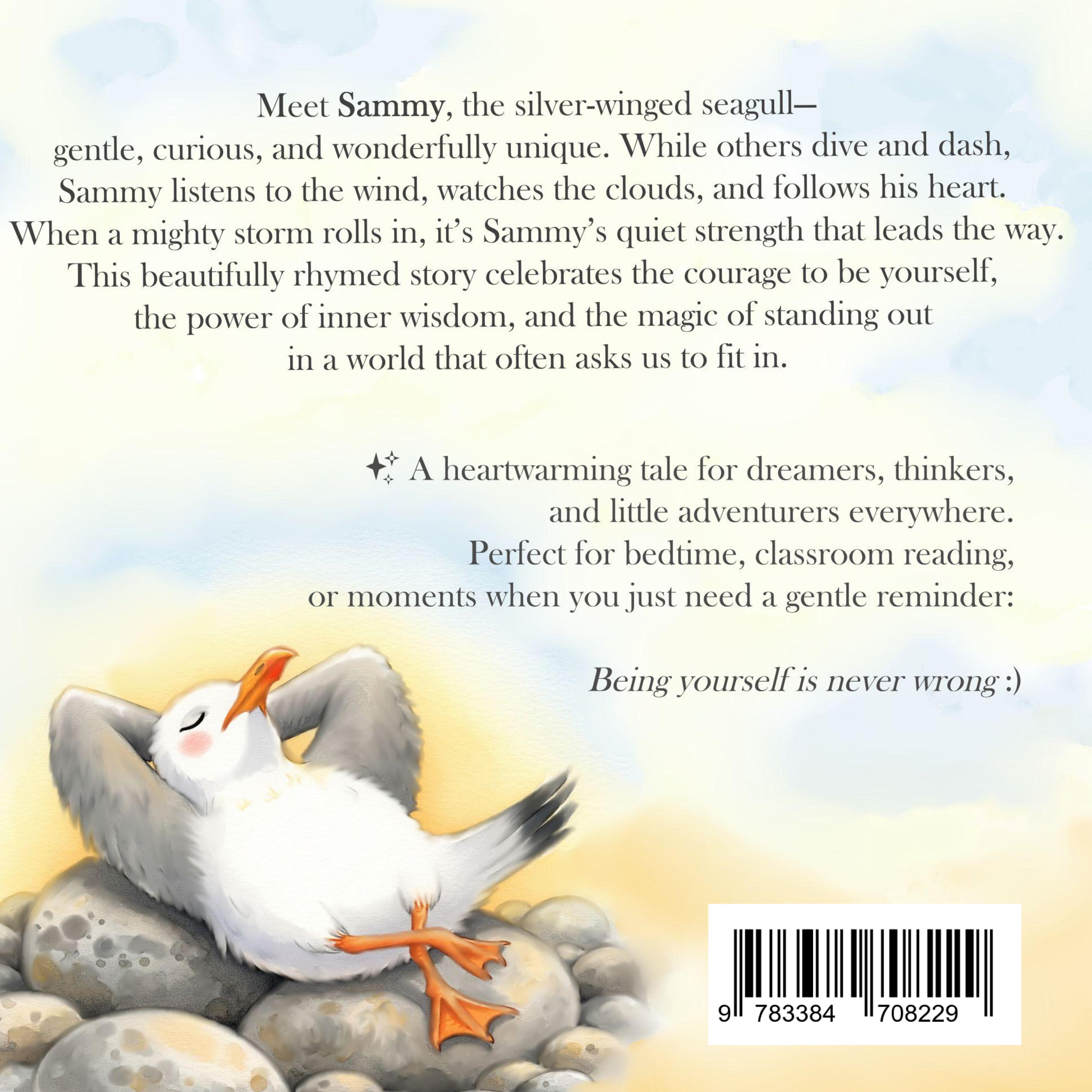 Meet Sammy, the silver-winged seagull - gentle, curious, and wonderfully unique. While others dive and dash, Sammy listens to the wind, watches the clouds, and follows his heart. When a mighty storm rolls in, it's Sammy's quiet strength that leads the way. This beautifully rhymed story celebrates the courage to be yourself, the power of inner wisdom, and the magic of standing out in a world that often asks us to fit in. A heartwarming tale for dreamers, thinkers, and little adventurers everywhere. Perfect for bedtime, classroom reading, or moments when you just need a gentle reminder: Being yourself is never wrong!For children from 3 years of age - and for anyone who listens, feels, and explains.This book is designed for young readers but speaks to all ages. It's perfect for reading aloud, sharing thoughts, and starting meaningful conversations that can last a lifetime. In today's fast-moving world, many children - and adults - struggle to keep pace with the demands and expectations of modern life. Often, people are seen as "different" simply because they don't fit into the way the majority functions. This book gently reminds us that being different is not only normal, but valuable. It celebrates diversity as the very thing that makes life colourful and wonderful.Whether you're exploring the topic of difference in a personal or professional context, this book offers a warm and accessible entry point. In a time when children grow up hearing terms like 'autism', 'neurodiversity', and other labels, it's important to remind them - and ourselves - that difference is part of being human.Lerne Sammy kennen - die Möwe mit den silbernen Flügeln: sanft, neugierig und wunderbar einzigartig. Während andere tauchen und hasten, lauscht Sammy dem Wind, beobachtet die Wolken und folgt seinem Herzen. Als ein mächtiger Sturm aufzieht, ist es Sammys stille Stärke, die den Weg weist.Diese liebevoll gereimte Geschichte feiert den Mut, man selbst zu sein, die Kraft innerer Weisheit und die Magie des Andersseins in einer Welt, die oft verlangt, sich anzupassen. Ein herzerwärmendes Buch für Träumer:innen, Denker:innen und kleine Abenteurer:innen überall. Ideal für das Einschlafritual, fürs gemeinsame Lesen im Klassenzimmer oder für jene Momente, in denen man eine sanfte Erinnerung braucht: Du selbst zu sein, ist niemals verkehrt Für Kinder ab 3 Jahren - und für alle, die zuhören, mitfühlen und erklären möchten.Dieses Buch richtet sich an junge Leser:innen im Vorschul- und Grundschulalter, eignet sich aber ebenso für Menschen jeden Alters, die gemeinsam lesen, nachdenken und ins Gespräch kommen möchten. In einer Welt, die sich immer schneller dreht, fällt es vielen Kindern - und auch Erwachsenen - schwer, mit dem Tempo und den Erwartungen der modernen Gesellschaft Schritt zu halten.Oft wird man als "anders" wahrgenommen, weil die Mehrheit auf eine bestimmte Weise funktioniert. Doch dieses Buch erinnert daran, dass Anderssein nicht nur normal, sondern wertvoll ist. Es lädt dazu ein, Vielfalt als Stärke zu begreifen - als das, was unser Leben bunt und wunderbar macht.Besonders für alle, die sich privat oder beruflich mit dem Thema Anderssein beschäftigen, bietet dieses Buch einen liebevollen Einstieg. In einer Zeit, in der Kinder mit Begriffen wie Autismus, Neurodiversität und anderen Fachbegriffen aufwachsen, ist es wichtig, ihnen zu zeigen: Du bist gut, so wie du bist.