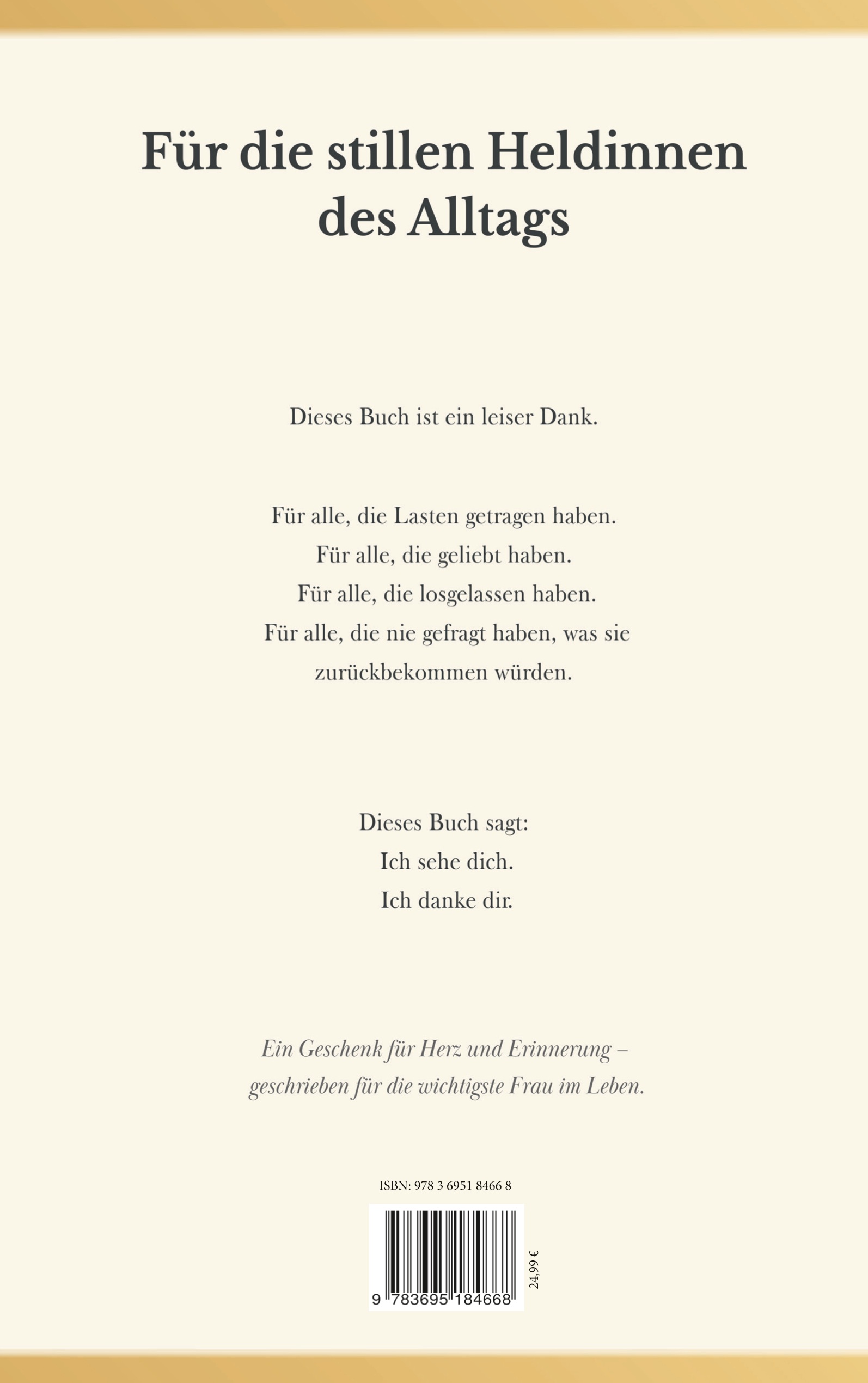| Schlagworte | Berührende Liebeserklärung an die eigene Mutter • Dankesbuch • Emotionales Dankesbuch für Mütter • Familie • Geschenk • Geschenkbuch für Mama voller Dankbarkeit • Geschenkbuch von Sohn an seine Mutter • Geschenk für Mama wenn Worte fehlen • Geschenkidee für erwachsene Kinder an Mama • Kleines Trostbuch für müde Mamas • Kurze Texte als Dank an Mama • Liebe • Liebevolles Mitbringsel für Mama Geburtstag • Literarisches Geschenkbuch zum Innehalten • Literaturgeschenk für starke Mütter • Mama • Persönliches Dankegeschenk von Tochter an Mutter • Poetisches Geschenkbuch mit kurzen Texten • Poetisches Geschenkbuch Mutterliebe • Spruchband Danke Mama für alles |