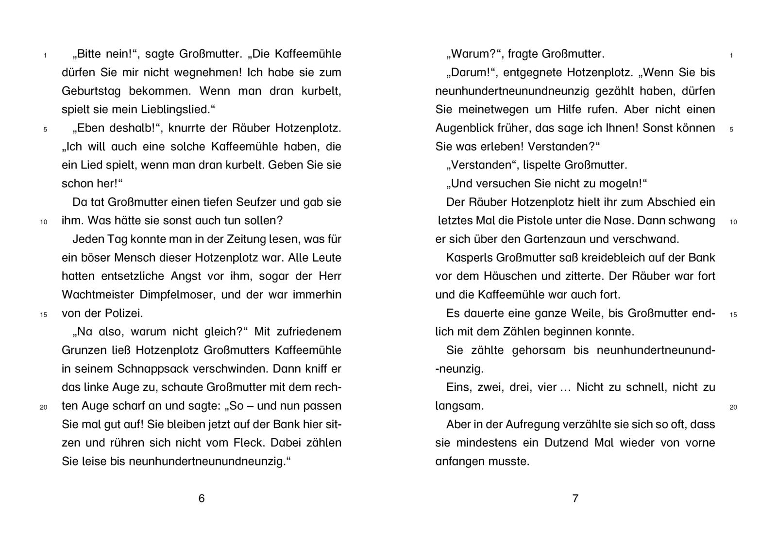 Das Schulbuch ist in großer Schrift gesetzt (Schriftart Schulbuch Nord) und bietet Zeilenangaben auf jeder Seite. Die lustige Geschichte rund um Kasperl, Seppel und den Räuber Hotzenplotz eignet sich hervorragend, um die Lesekompetenz in der Grundschule zu fördern und das Lesen zu trainieren. Für diese Schullektüre gibt es auch Unterrichtsmaterial mit Kommentar und Kopiervorlagen für Lehrerinnen und Lehrer.