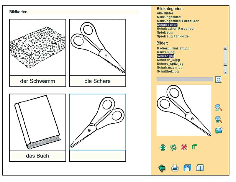 • Eine reiche Sammlung von schwarzweißen und farbigen Bildern zu Nomen der Themenfelder Spielzeug, Schulsachen und Nahrungsmittel: neben allen Bildern aus der Kopiervorlage bietet die CD viele zusätzliche Bilder zu den gleichen Themenfeldern