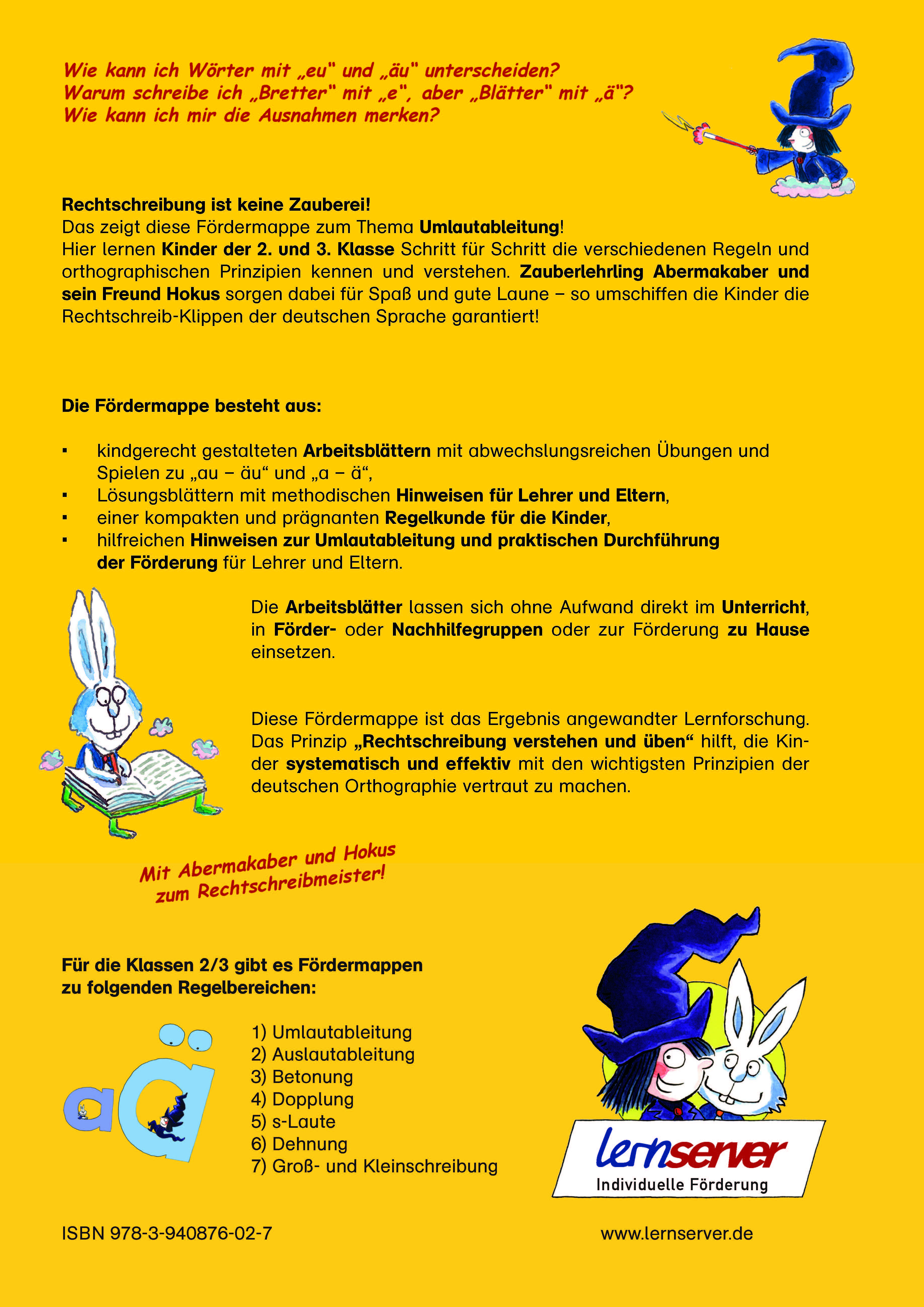 Die Reihe "Rechtschreibung verstehen und üben" macht Kinder der 2. und 3. Klasse systematisch und effektiv mit den wichtigsten Prinzipien der deutschen Orthographie vertraut. Zauberlehrling Abermakaber und sein Freund Hokus sorgen dabei für Spaß und gute Laune. Alle Schülerbände bestehen aus farbigen, einseitig bedruckten Arbeitsblättern mit abwechslungsreichen Übungen und Spielen, Hinweisen für Lehrer und Eltern, einer kompakten und prägnanten Regelkunde für Kinder sowie Hinweisen zu den Regelbereichen und zur praktischen Durchführung der Förderung für Eltern und Lehrer. Die perforierten Arbeitsblätter lassen sich ohne Aufwand direkt im Unterricht, in Förder- oder Nachhilfegruppen oder zur Förderung zu Hause einsetzen.Die Fördermappe (104 Seiten) besteht aus:farbigen, einseitig bedruckten Arbeitsblättern mit abwechslungsreichen Übungen und Spielen zur Umlautableitung, Lösungsblättern mit methodischen Hinweisen für Lehrer und Eltern,einer kompakten und prägnanten Regelkunde für die Kinder,hilfreichen Hinweisen zur Umlautableitung und praktischen Durchführung der Förderung für Lehrer und Eltern.Die Fördermappen-Reihe ist Bestandteil des Bildungsprojektes "Lernserver der Uni Münster - Individuelle Förderung".