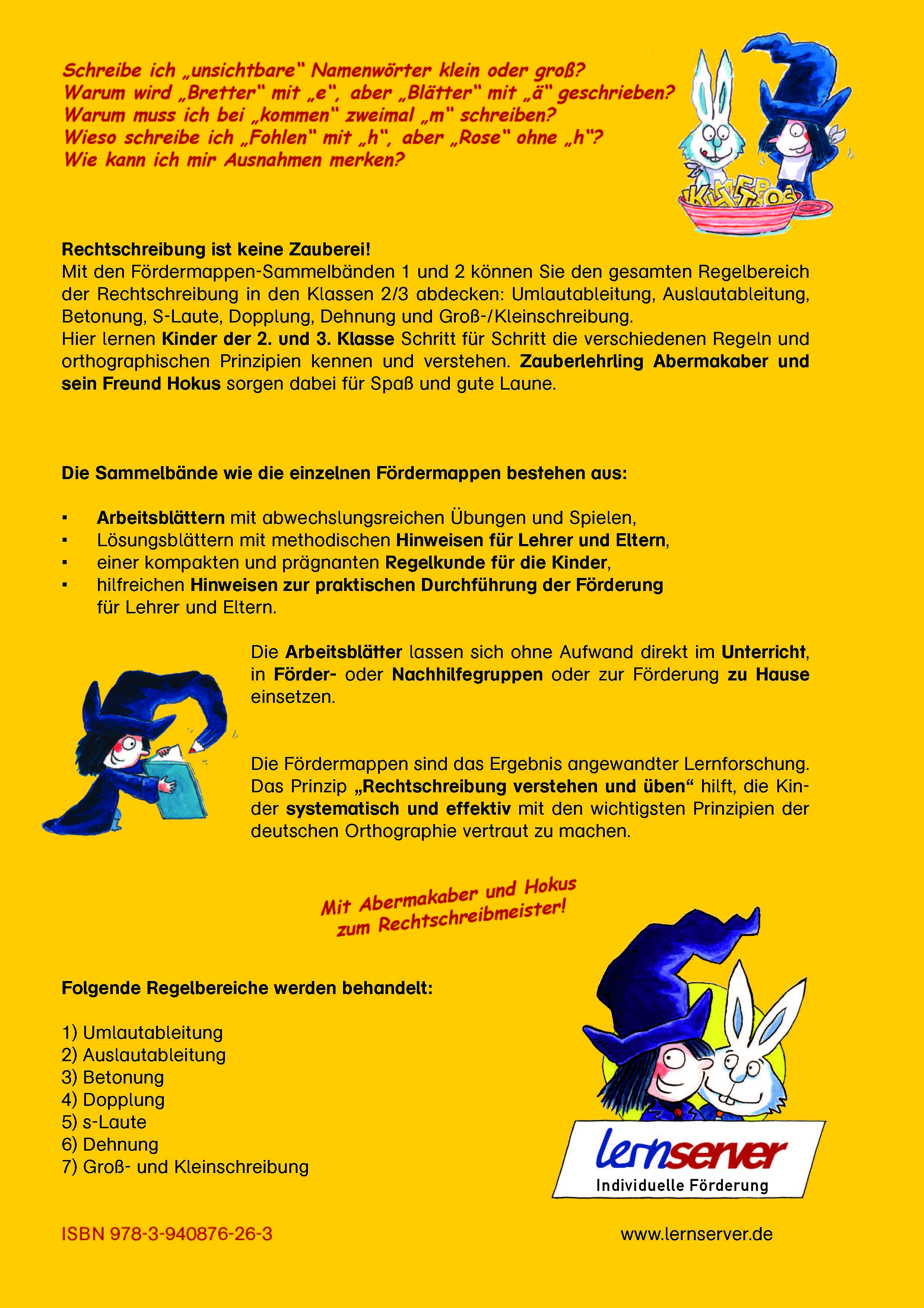 Zauberlehrling Abermakaber und sein Freund Hokus sorgen dabei für Spaß und gute Laune. Alle Schülerbände bestehen aus farbigen, einseitig bedruckten Arbeitsblättern mit abwechslungsreichen Übungen und Spielen, Lösungsblättern mit methodischen Hinweisen für Eltern und Lehrer, einer knappen, kompakten Regelkunde für die Kinder sowie Hinweisen zu den Regelbereichen und zur praktischen Durchführung der Förderung in der Schule und zu Hause.