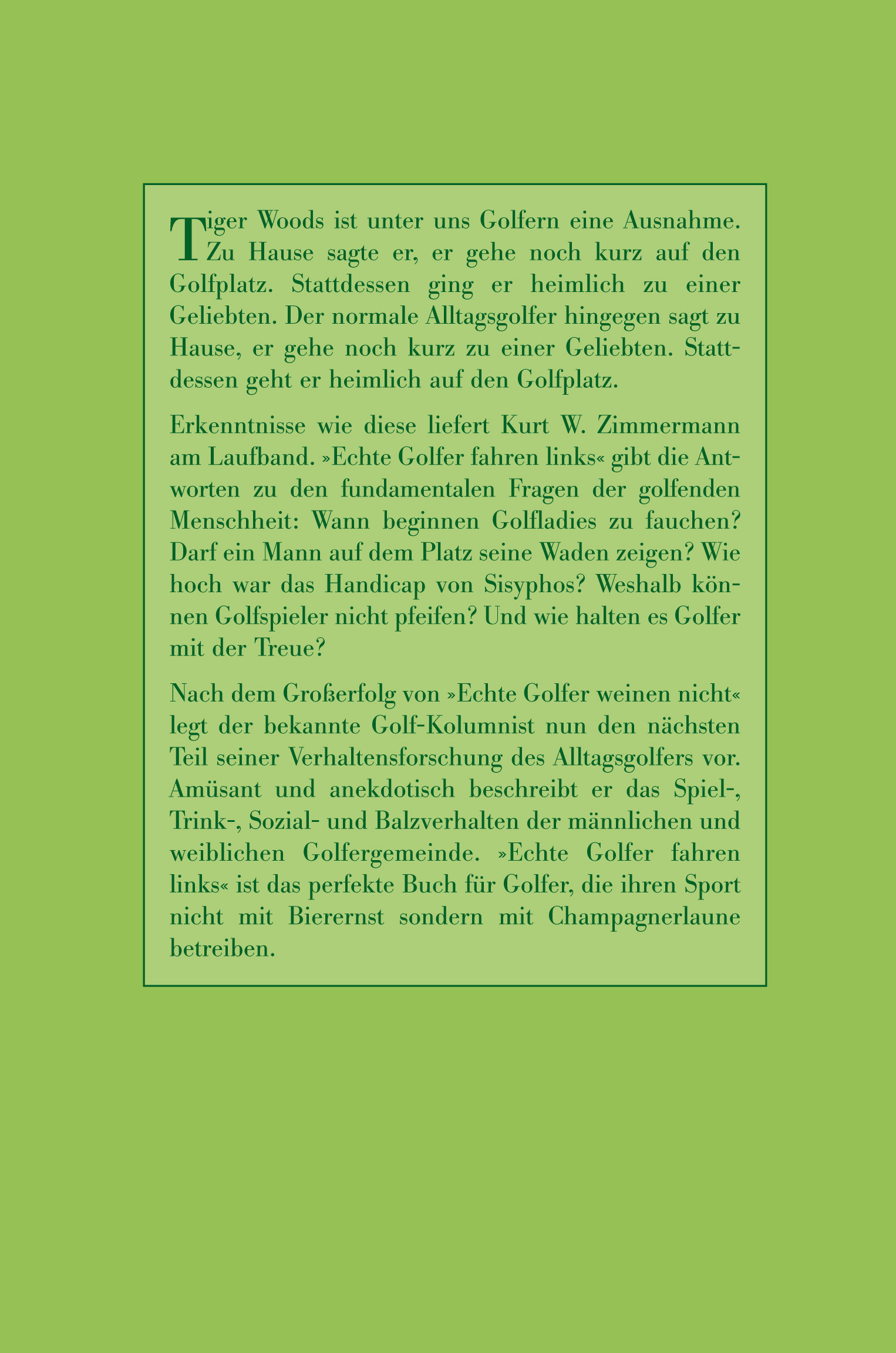 Tiger Woods ist unter uns Golfern eine Ausnahme. Zu Hause sagte er, er gehe noch kurz auf den Golfplatz. Stattdessen ging er heimlich zu einer Geliebten. Der normale Alltagsgolfer hingegen sagt zu Hause, er gehe noch kurz zu einer Geliebten. Stattdessen geht er heimlich auf den Golfplatz. Erkenntnisse wie diese liefert Kurt W. Zimmermann am Laufband. "Echte Golfer fahren links" gibt die Antworten zu den fundamentalen Fragen der golfenden Menschheit: Wann beginnen Golfladies zu fauchen? Darf ein Mann auf dem Platz seine Waden zeigen? Wie hoch war das Handicap von Sisyphos? Weshalb können Golfspieler nicht pfeifen? Und wie halten es Golfer mit der Treue? Nach dem großen Erfolg von "Echte Golfer weinen nicht" legt der bekannte Golf-Kolumnist nun den nächsten Teil seiner Verhaltensforschung des Alltagsgolfers vor. Amüsant und anekdotisch beschreibt er das Spiel-, Trink, Sozial- und Balzverhalten der männlichen und weiblichen Golfergemeinde. "Echte Golfer fahren links" ist das perfekte Buch für Golfer, die ihren Sport nicht mit Bierernst sondern mit Champagnerlaune betreiben