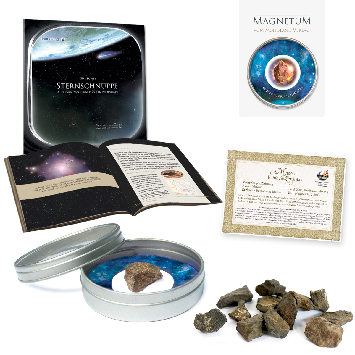 | Zusatzinfo | Hintergründe über Herkünft und Entstehung von Meteoriten. Das Begleitbüchlein zum Sternschnuppen-Geschenk vom Mondland Verlag. Im Lieferumfang enthalten ist zusätzlich dieses Büchlein als kleine Meteoritenkunde und ein Meteoritenfragment aus Nord-West-Afrika mit Echtheits-Zertifikat. Echte Sternschnuppe als Geschenk in Sammlerbox mit Schauglasdeckel. |