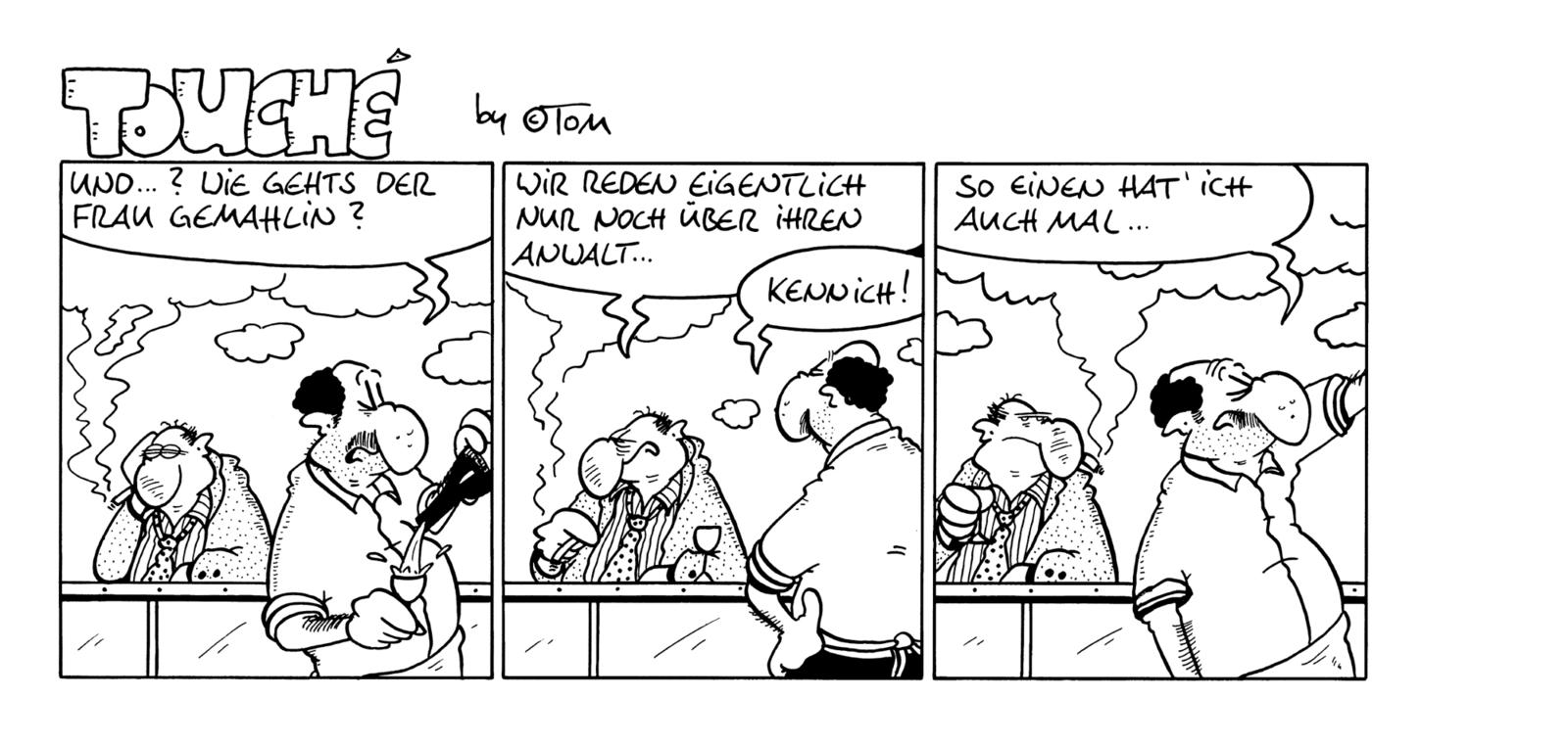©TOM, eigentlich Thomas Körner, ist 1960 in Säckingen geboren. Er lebt in Berlin. Seit 1991 erscheinen seine Touché-Comicstrips täglich in der taz. In inzwischen 30 Jahren sind über 9.000 Touché-Strips entstanden. Je 500 sind in je einem Band zusammengefasst, den sogenannten „Ziegeln", von denen inzwischen 17 Bände entstanden sind. Die Caricatura Galerie in Kassel hat ©Tom ein Denkmal gewidmet.