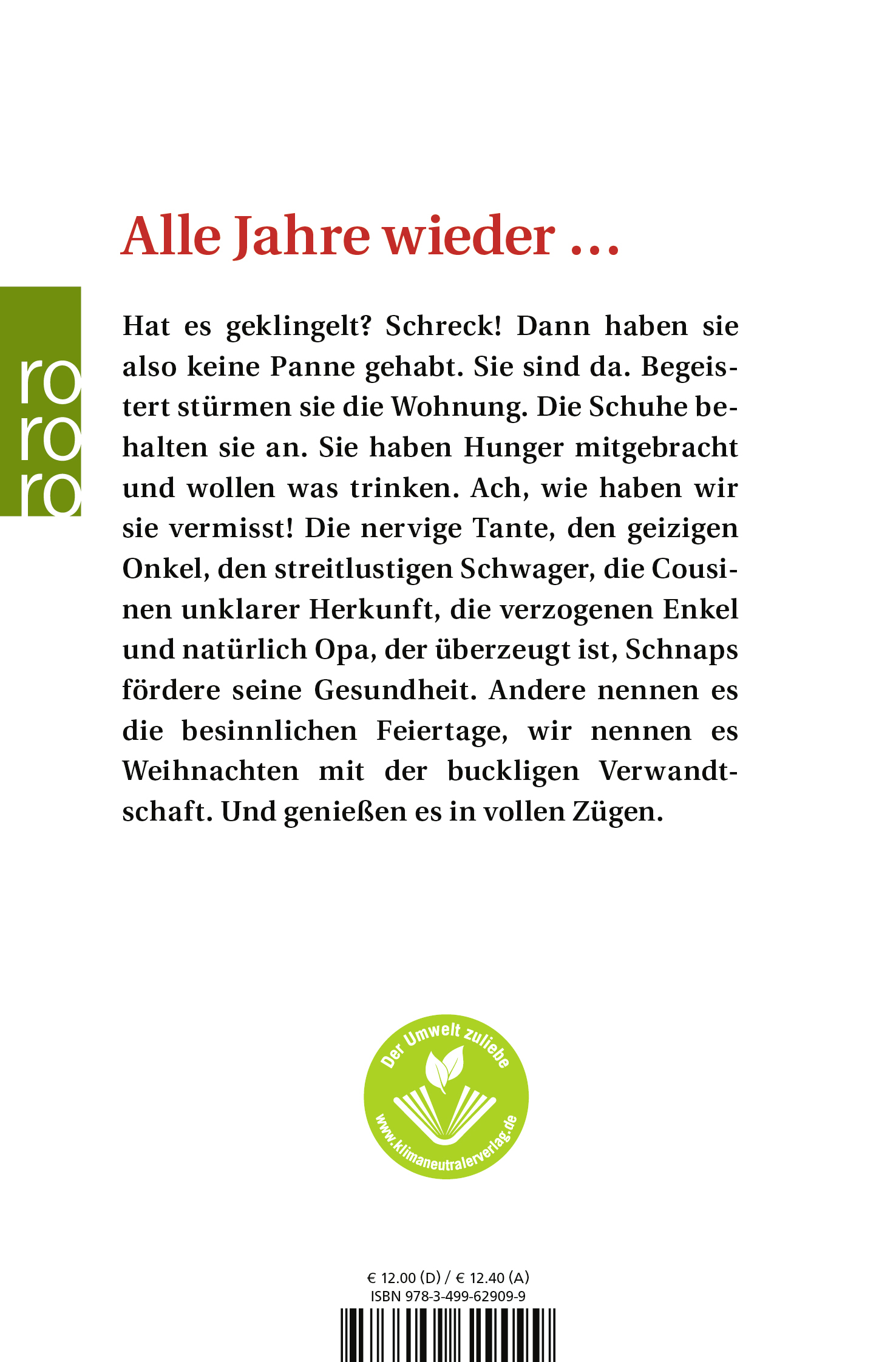 Hat es geklingelt? Schreck! Dann haben sie also keine Panne gehabt. Sie sind da. Begeistert stürmen sie die Wohnung. Die Schuhe behalten sie an. Sie haben Hunger mitgebracht und wollen was trinken. Ach, wie haben wir sie vermisst! Die nervige Tante, den geizigen Onkel, den streitlustigen Schwager, die Cousinen unklarer Herkunft, die verzogenen Enkel und natürlich Opa, der überzeugt ist, Schnaps fördere seine Gesundheit. Andere nennen es die besinnlichen Feiertage, wir nennen es Weihnachten mit der buckligen Verwandtschaft. Und genießen es in vollen Zügen.