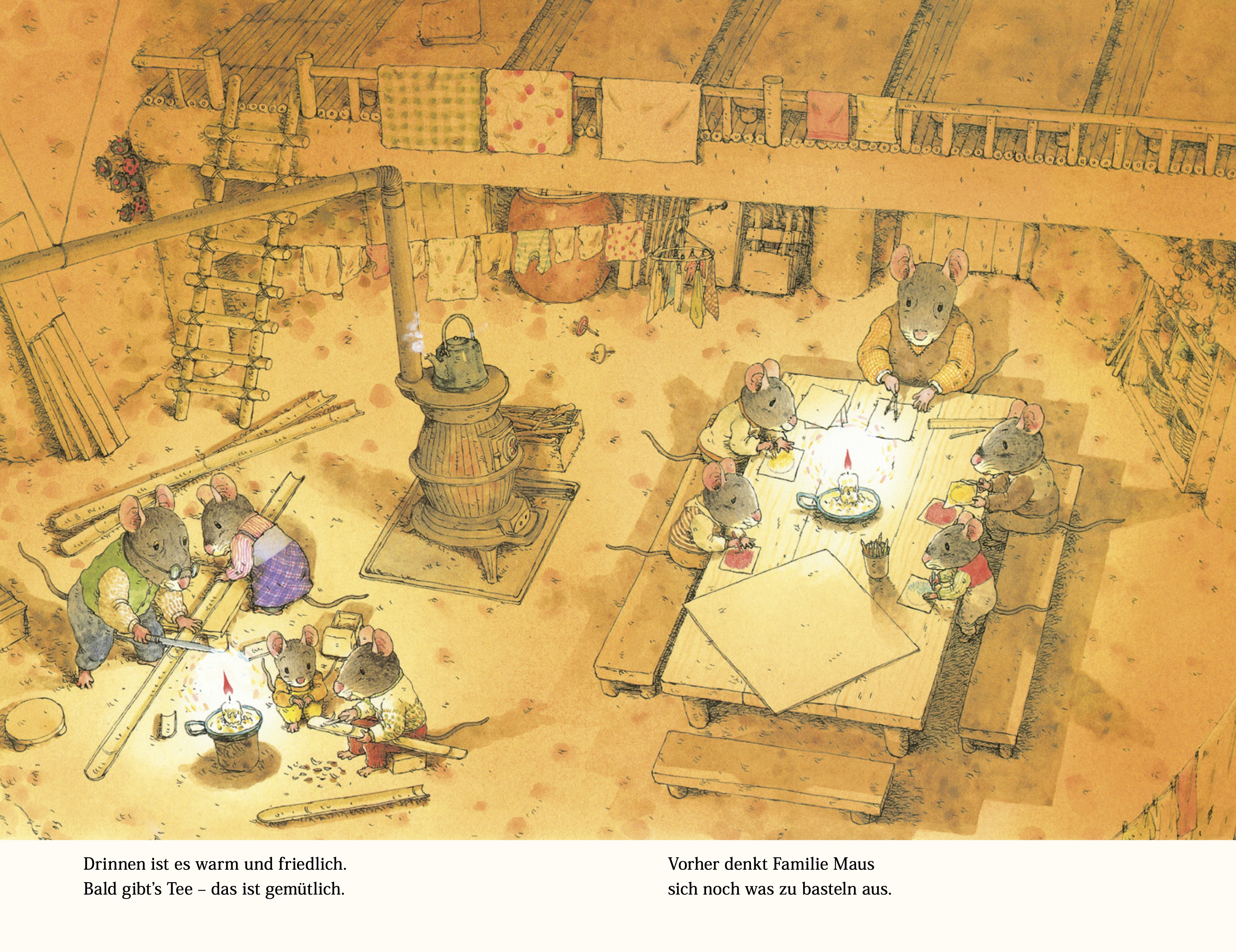 Das ist ein Tag ganz nach dem Geschmack der Mäusekinder: Draußen vor der Tür liegt der Wald tief verschneit. Drinnen ist es schön warm. Der Opa baut mit den Kleinen einen Schlitten. Die Oma backt ihre wunderbaren süßen Klöße. Nach dem Essen geht es nichts wie raus und rauf auf die Schlitten. Rasant ist die Abfahrt und endet mitten im Schnee. Müde und glücklich kehren die Mäusekinder heim und fallen in ihre Betten.