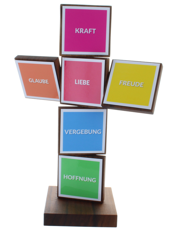 Durch die Aufteilung in sechs einzelne bewegliche quadratische Elemente bleibt das Kreuz immer Kreuz, verändert sich aber in seinem Äußeren. Mit den zwölf beidseitig bedruckten Motivplaketten können Sie selbst das Erscheinungsbild des Kreuzes variieren. Hochwertig produziert in Deutschland.