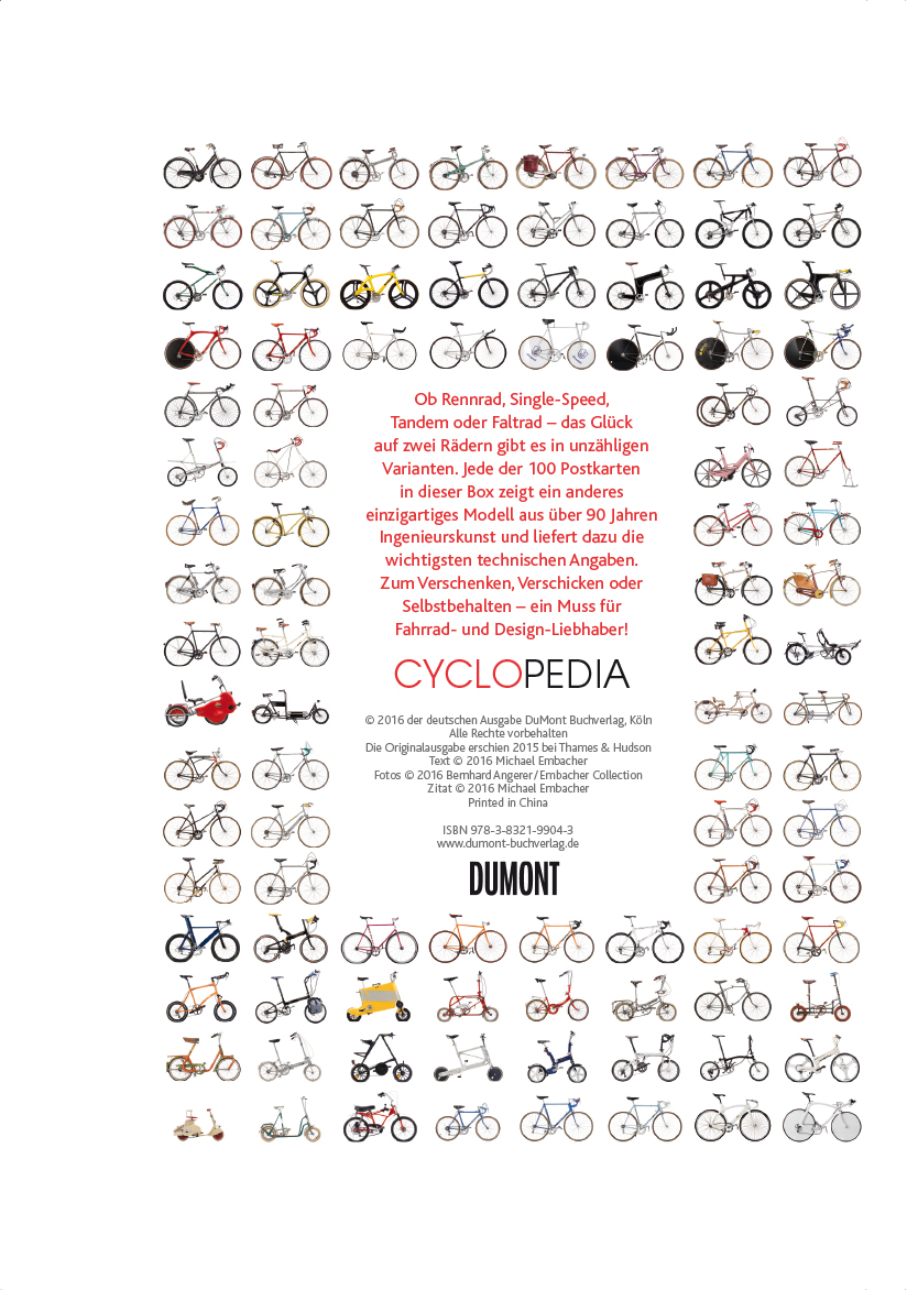 | Schlagworte | Bremsen • Fahrrad • Faltrad • Hersteller • Ingenieurskunst • Kultobjekt • Michael Embacher • Postkarte • Rahmen • Reifen • Rennrad • Single-Speed • Tandem |