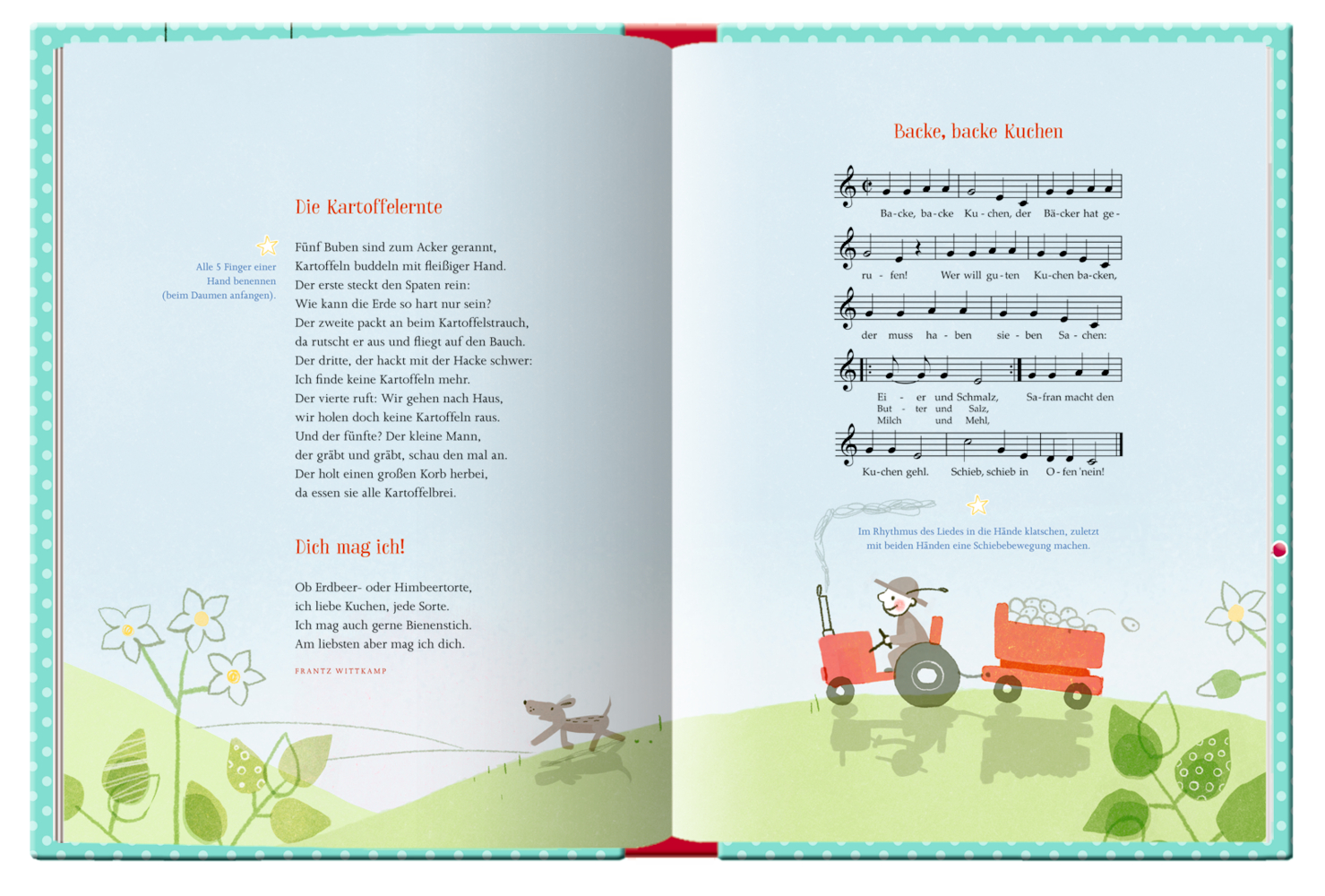 | Schlagworte | Anthologie • Baby • Bewegen & Tanzen • Coppenrath Hölker Bohem • Essen & Trinken • Fahrzeuge • Familie & Alltag • Fingerspiele • Frühling • Geburtsgeschenk • Hausbuch • Hausbuch / Familienbuch • Hausbuch/Familienbuch • Hausschatz • Herbst • Kind • Kinder • Kinderlieder • Kinderreime • Lieder • Reime & Lieder • Sammlung |