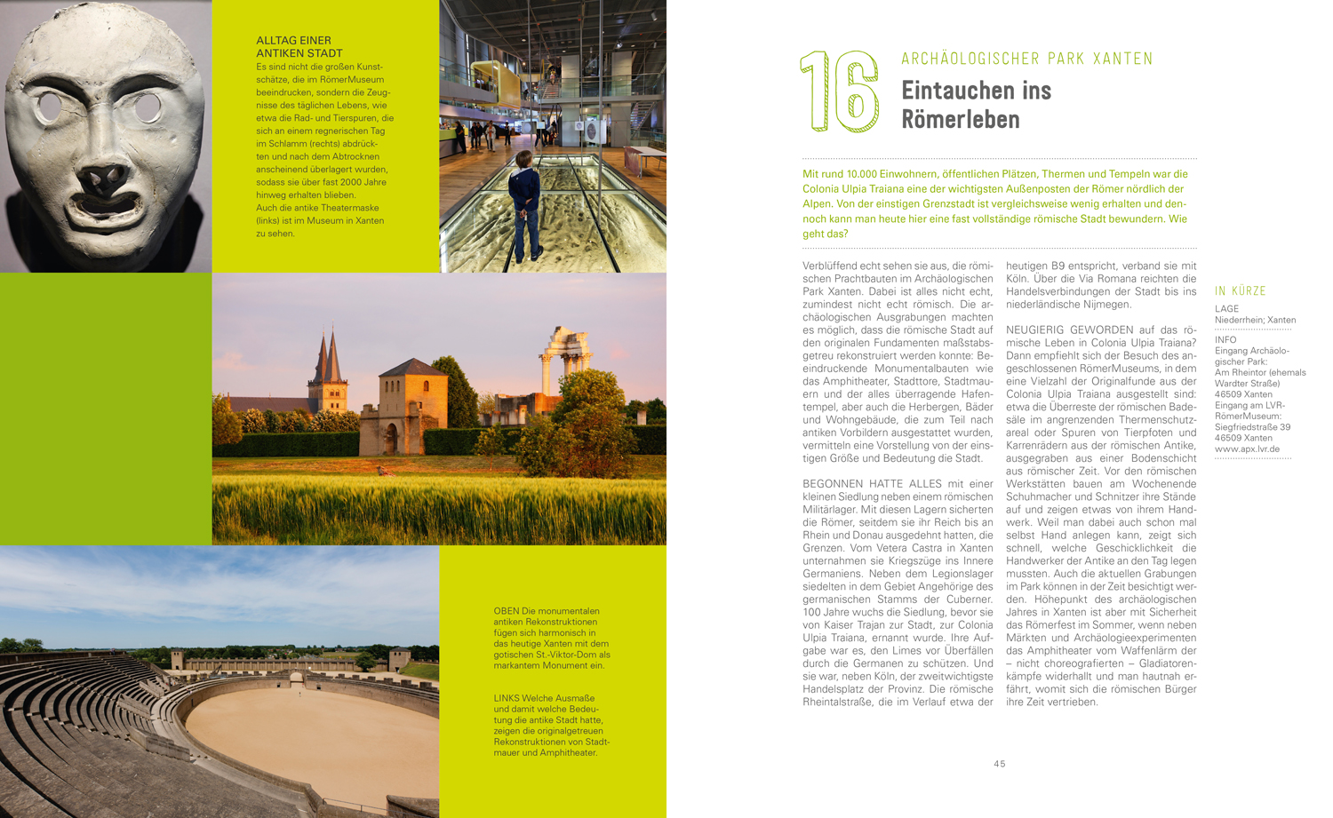Insgesamt 100 interessante Ausflugszielen in 10 Themenkapiteln laden zum Schmökern oder zur Reisevorbereitung ein. Jedes Ziel wird auf einer Doppelseite vorgestellt - mit stimmungsvollen Bildern und Texten, die neugierig machen. Den Kölner Dom kennen viele, aber wer war schon einmal auf seinem Gewölbe spazieren? Was hat es mit dem Hexenbürgermeisterhaus in Lemgo auf sich? Wo steht die älteste Fabrik Deutschlands? Und was muss man wissen, wenn man auf der Rur paddelt? Zur geografischen Orientierung gibt es eine Überblickskarte am Beginn des Buches und kleine Kärtchen am Anfang der Kapitel. Ob für einen Tagesausflug oder für eine “Reise im Kopf“ - dieses Buch bietet alles, was man dafür braucht!