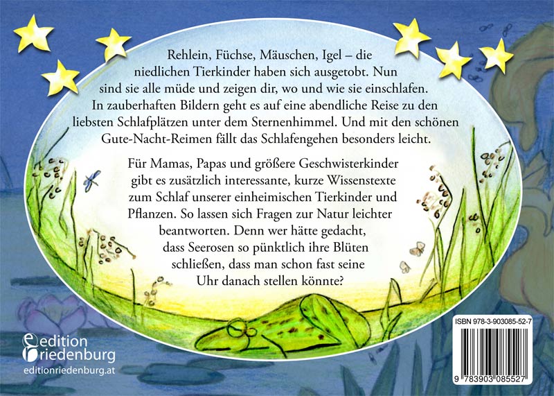 Schön, so schön war dieser Tag. Nun ist der Abend da. Alle Tiere schlafen ein, und du schläfst auch beinah. Rot und röter geht die Sonne hinterm Garten unter. Die Amselkinder schlafen schon, eins drüber und zwei drunter. Lang und länger fall´n die Schatten auf das Ackerland. Die kleinen Mäuse schlafen auch, sind müde allesamt. Leise, leise kommt die Nacht, und still liegt nun der Teich. Alle Entenkinder schlafen, ihr Nest ist warm und weich. ... *Wer schläft denn hier? Nacht-Wissen für kleine Nachfrager * Das Europäische Reh (Capreolus capreolus) ist in der Dämmerung noch sehr aktiv. Es schläft unregelmäßig über Tag und Nacht verteilt. Kitze – so heißen die Jungtiere – suchen sich ihre Liegeplätze unter Büschen oder im hohen Gras. Sie ruhen dort allein ohne Geschwister und ohne Mutter. Oft liegt das Kitz eingerollt auf dem Bauch am Boden. Die Mutter, Ricke genannt, besucht das Kitz nur zum Säugen. Die Gemeine Hasel (Corylus avellana) bietet nachts vielen Tieren Schutz. Sowohl Vögel als auch Insekten halten in den Sträuchern Nachtruhe. Dazu gehört zum Beispiel der Haselnussbohrer. Das ist ein kleiner Käfer, der die reifen Haselnüsse anbohrt und dort seine Eier hineinlegt. Das Eichhörnchen holt sich Haselnüsse als Abendbrot.