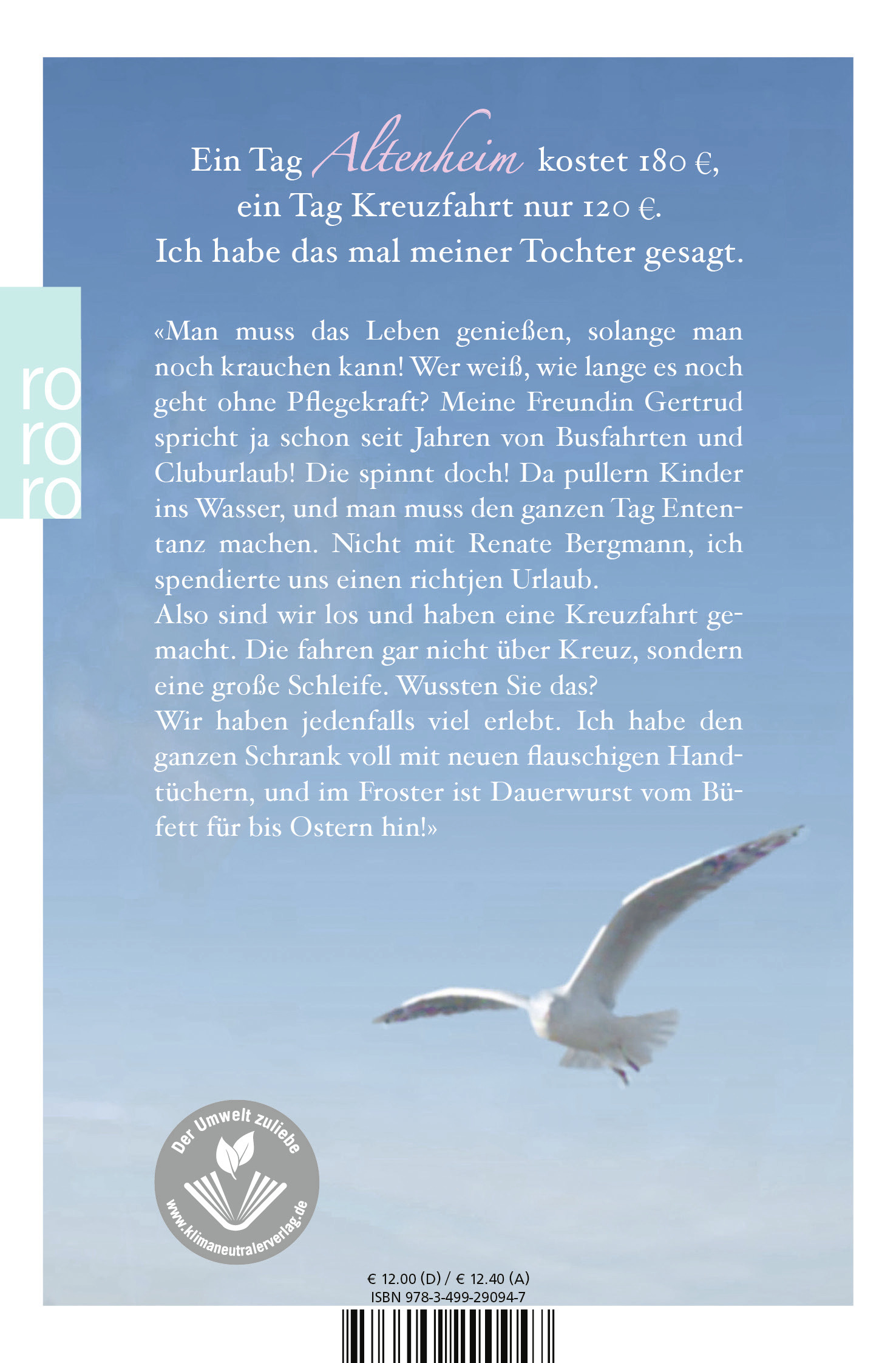 «Man muss das Leben genießen, solange man noch krauchen kann! Wer weiß, wie lange es noch geht ohne Pflegekraft? Meine Freundin Gertrud spricht ja schon seit Jahren von Busfahrten und Kluburlaub! Die spinnt doch! Da pullern Kinder ins Wasser und man muss den ganzen Tag Ententanz machen. Nicht mit Renate Bergmann, ich spendierte uns einen richtjen Urlaub.