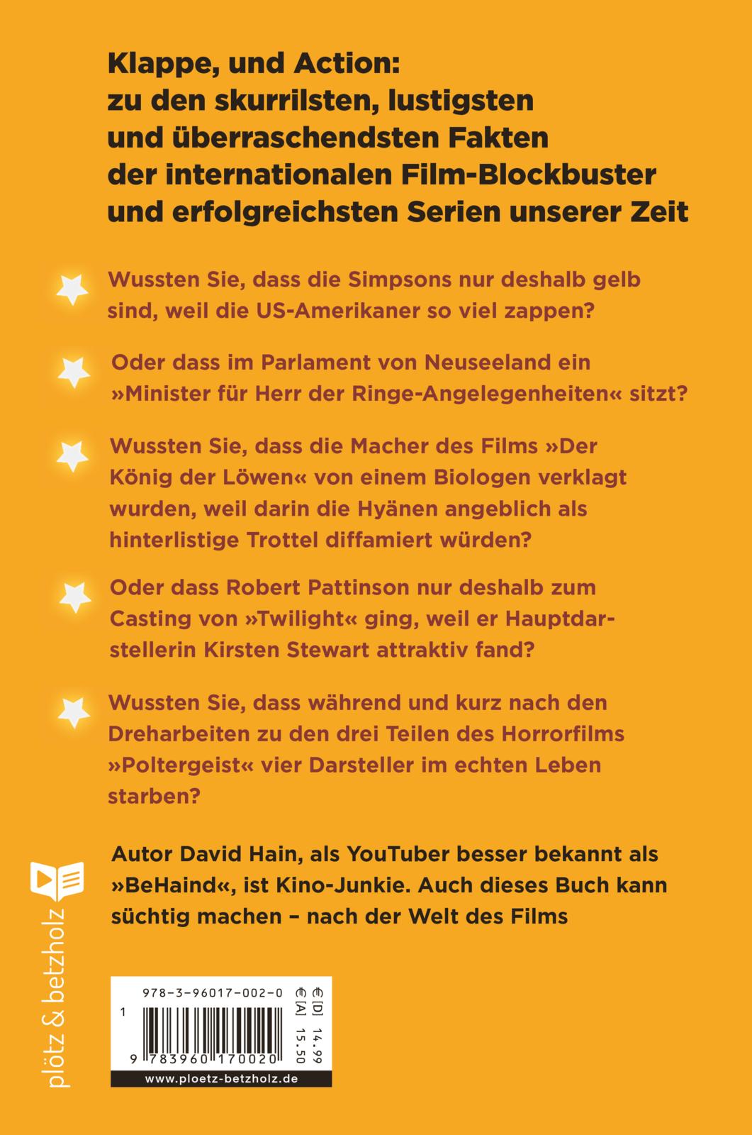 David Hain, Jahrgang 1981, aus Berlin betreibt den YouTube-Kanal "BeHaind" mit über 350.000 Abonnenten. Seine Film-Trivia-Folgen gehören zu seinem Markenzeichen und zählen zu den erfolgreichsten Videos seines Kanals. 2015 und 2016 gewann David Hain den Deutschen Webvideopreis und ist damit in den Kreis der bekanntesten YouTuber vorgestoßen.