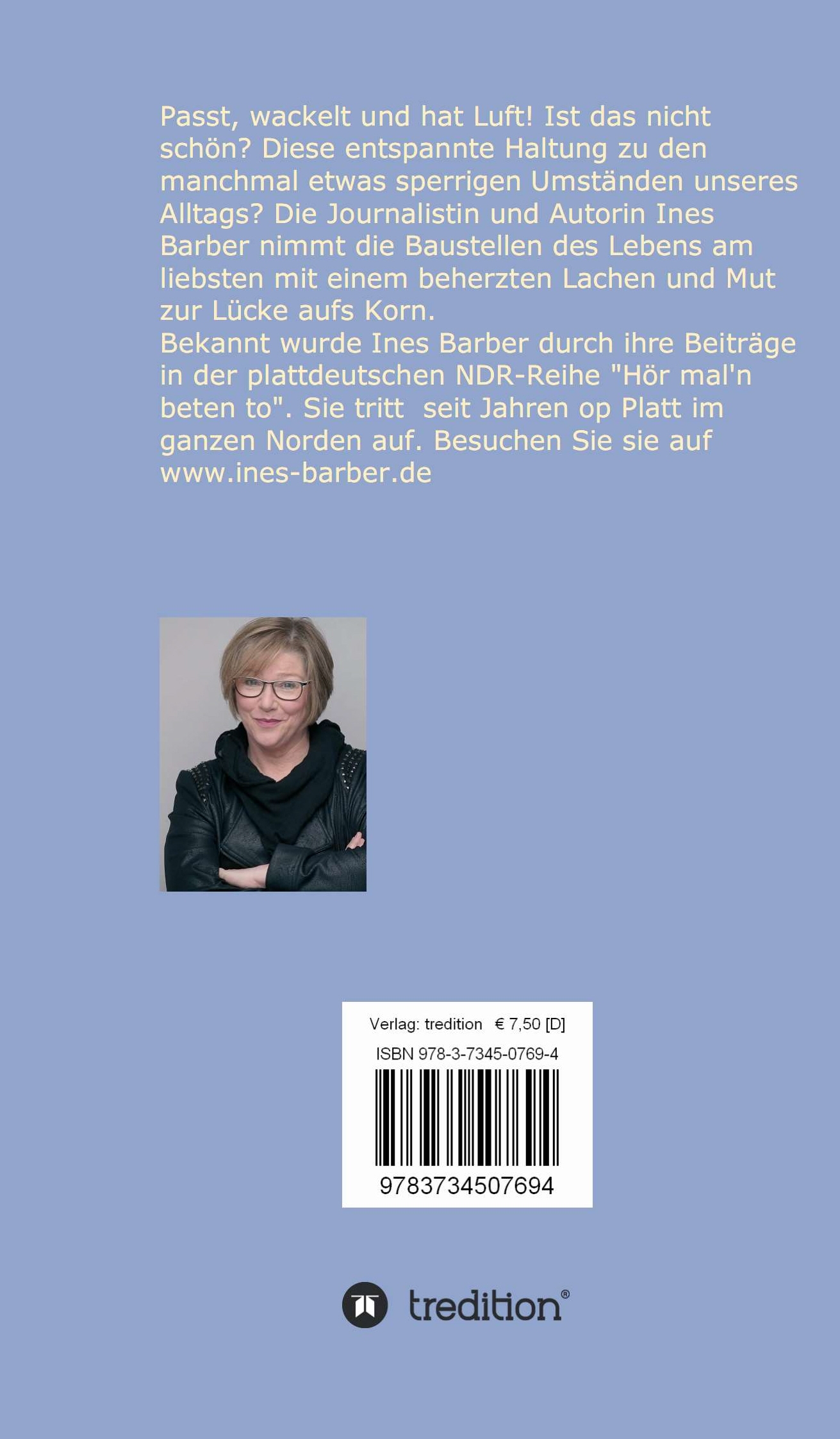 Ines Barber wurde 1957 in Rendsburg geboren und sollte eigentlich mal das väterliche Bauunternehmen fortführen. Doch die Lust am Schreiben und Schnacken war größer. Nach Zeitungsvolontariat und Studium der Literaturwissenschaft zog es sie dann zum Radio. Nach etlichen Jahren im Privatradio landete sie schließlich beim NDR in Kiel. Mittlerweile schreibt und spricht sie seit über drei Jahrzehnten auch auf Plattdeutsch. Immer am Puls der Menschen, warmherzig, humorvoll, direkt. Ines Barber hat bereits vier Bücher und zwei Hörbücher veröffentlicht.