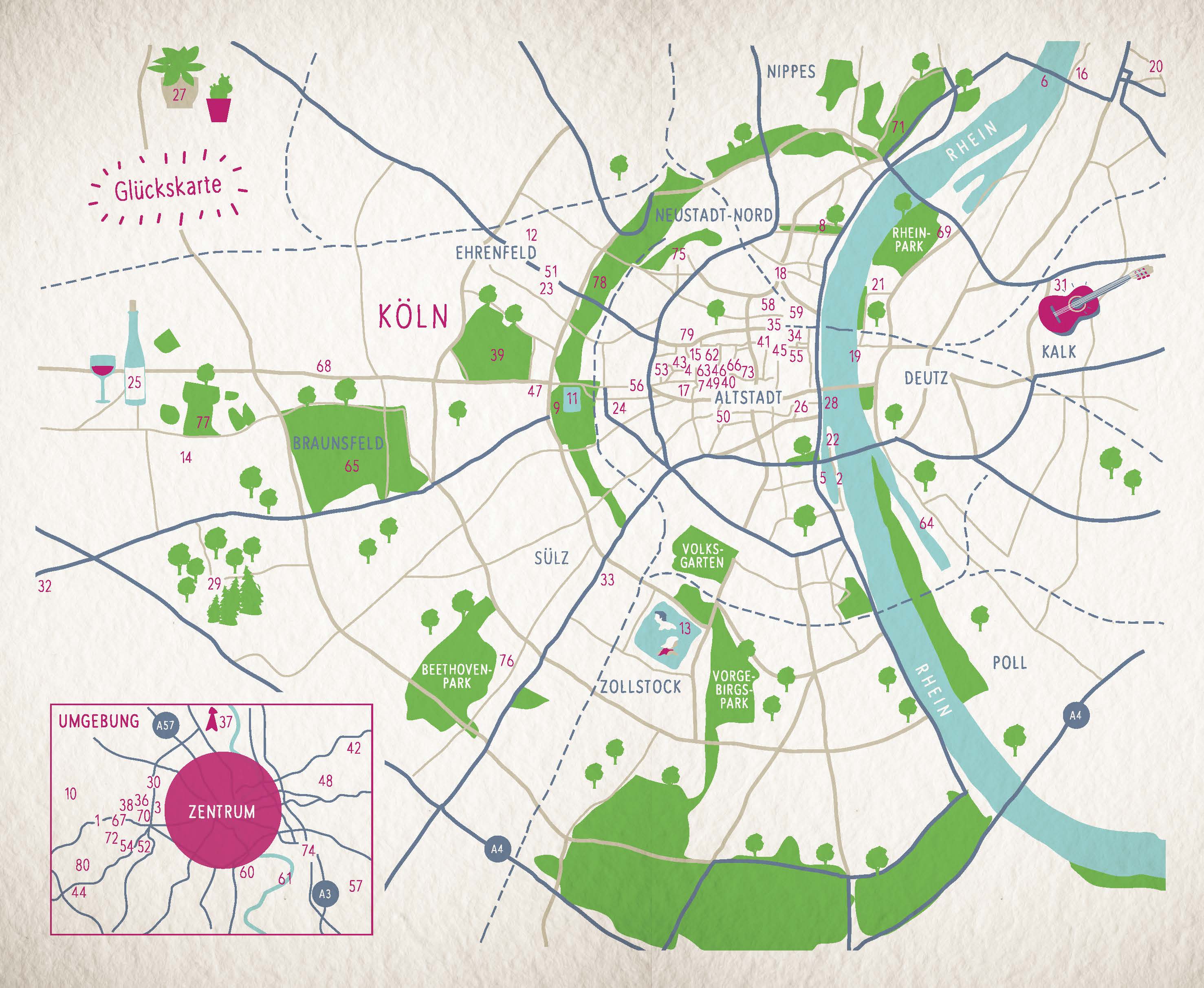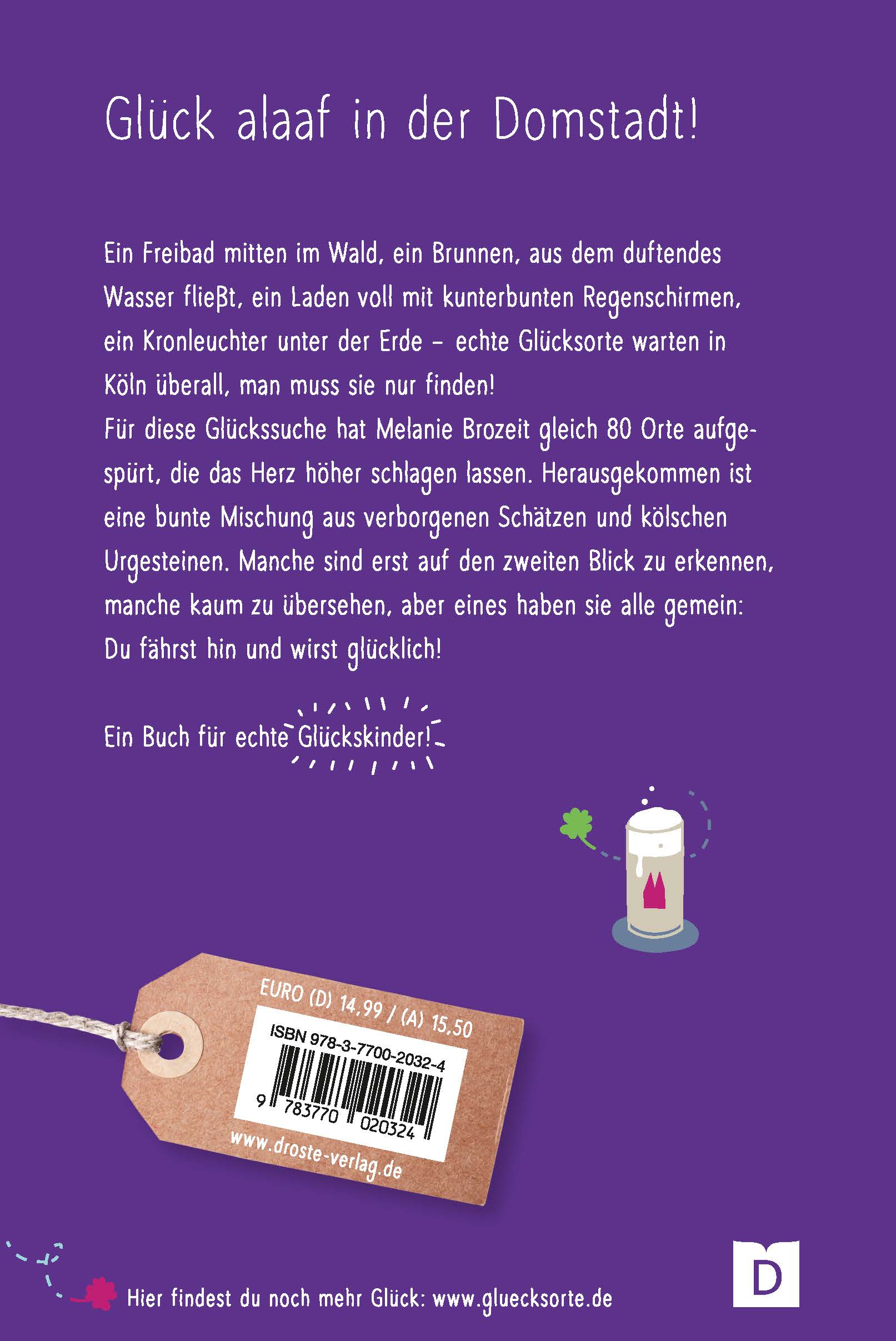 Süße Törtchen in Nippes, Kronleuchter in der Kanalisation, eine Wohngemeinschaft im Belgischen Viertel, die Gemüse-Parzelle in Dellbrück - in Köln glücklich zu werden ist mit "Glücksorte in Köln" ganz leicht. Gleich 80 bezaubernde Orte hat Melanie Brozeit in der Domstadt aufgespürt. Dafür war sie viel unterwegs - in der KVB in der Linie 7, am Aachener Weiher bei Sonnenschein oder auf den Treppen am Dom mit einem fröhlichen Stimmengewirr drum herum. Herausgekommen ist eine bunte Mischung aus versteckten Schätzen und kölschen Urgesteinen: Einige der Orte sind überraschend, manche gehören für all jene, die hier leben, arbeiten und glücklich sind, vielleicht längst zum Alltag. Oft reicht ein kleiner Perspektivwechsel, und im Nu ist das Glück gefunden: hoch oben zwischen den Wolken, auf dem Teller bei Sushi, Sandwich oder Kebab, im oder auf dem Wasser, zwischen Blumen, Gitarren und Pfeifen. In der Ruhe, aber auch im Trubel. Und in der Nachbarschaft, in Kerpen, Frechen oder Rodenkirchen. Schon beim Durchblättern macht "Glücksorte in Köln" bereits genau das, was es soll: glücklich. Das liegt auch an den schönen Fotos von Peter Jännert, dem Lieblingsmenschen und Ehemann von Melanie Brozeit. Wie seine Frau ist er der Meinung, dass die Domstadt mindestens eine der schönsten Städte Deutschlands ist. "Diese 80 Glücksorte nehmen Sie mit in die Ferien am Rhein (links und rechts davon). Ob als Besucher oder Einheimischer. Wir lernen dabei diese glückliche Metropole vielleicht von ganz neuen Seiten kennen. Um festzustellen, dass das Glück gerade dann um die Ecke kommt, wenn man es nicht erwartet. Das ist wie in der Liebe", findet Melanie Brozeit Finde dein Glück auch auf www.gluecksorte.de.