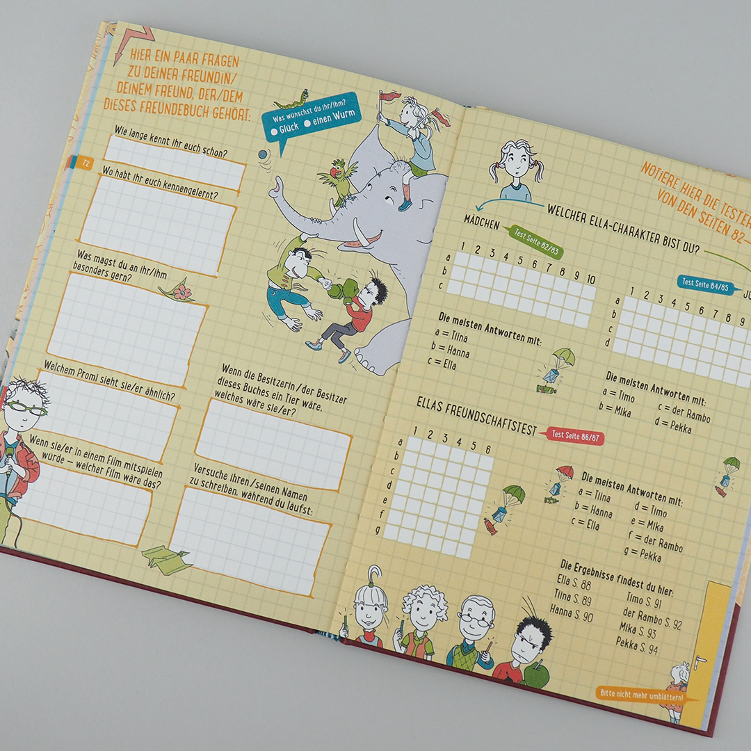 Welche Superkräfte würdest du gerne besitzen? Wo versteckst du deine Popel? Ist dein Lieblingsfach auch das im Kühlschrank, in dem sich die Süßigkeiten befinden? Diese und noch mehr Fragen gibt es in dem extralustigen Ella-Freundebuch zu beantworten. Hier können Freunde getestet werden - oder auch die Nerven des Lehrers in der Schule. Man kann herausfinden, welcher Charaktertyp man ist - geduldig, ehrlich oder doch zerstreut? Und natürlich ist auch ein Geburtstagskalender enthalten, spaßige Kreativaufgaben und viel Platz für alles, was man in einer echten Freundschaft über den anderen wissen sollte. Das ideale Geschenk für alle Kinder, die Ella lieben, und alle, die sie noch kennenlernen wollen.
