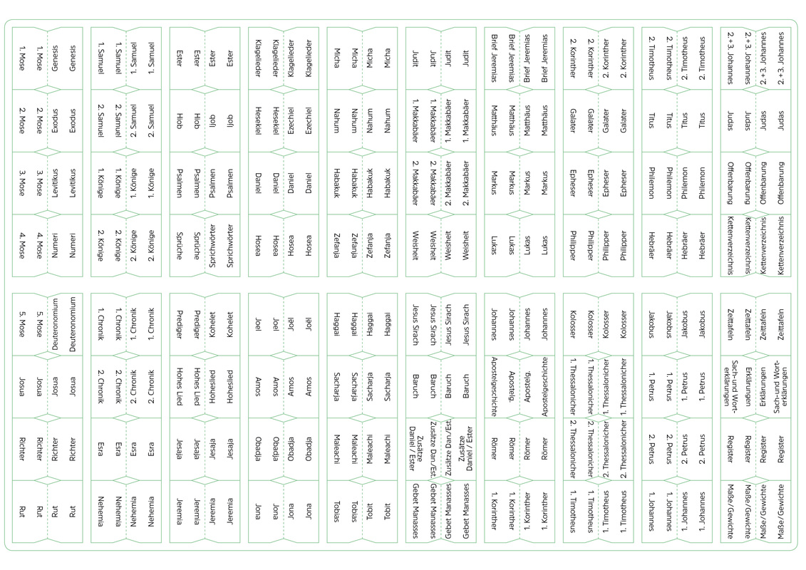Hiermit kann man jede Bibelstelle viel schneller aufschlagen! Dieses schwarze Bibel-Griffregister zeigt an, wo jedes einzelne biblische Buch beginnt. Enthalten sind auch Register-Reiter für Apokryphen und katholische Bibelbuch-Bezeichnungen, ferner weitere Reiter für verschiedene Studienbibeln. Dieses Bibel-Griffregister kann leicht in die eigene Bibel eingeklebt werden.