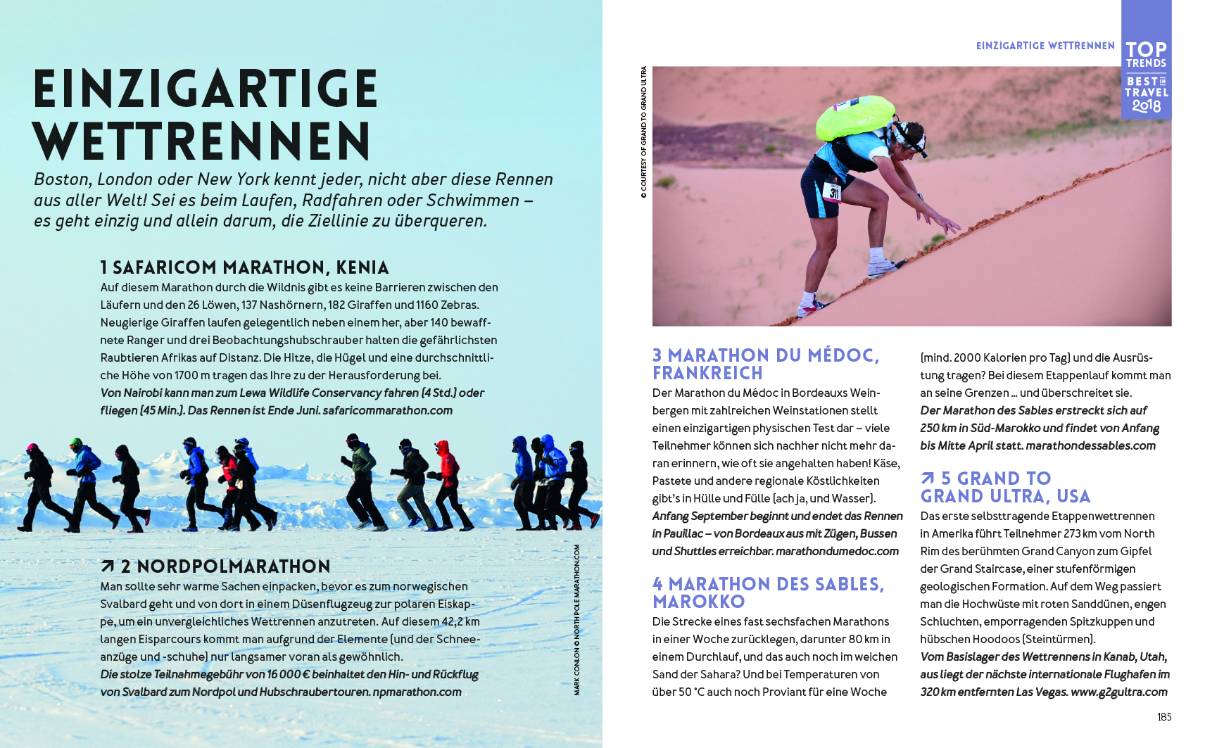 Dazu kommen vier Ranking-Listen nach Themen mit Reiseinspirationen für den ganz besonderen Trip. Zu ihnen gehören die zehn Reiseziele mit dem besten Preis-Leistungsverhältnis, die zehn besten Kulturtrips für Familien, die zehn angesagtesten Neueröffnungen und die zehn neuesten Übernachtungsangeboten des Jahres 2018. Fünf weitere Listen stellen die neusten Toptrends des Reisens vor: schweißtreibende Wettrennen in den Disziplinen Laufen, Radfahren und Schwimmen, auf Reisen vegetarisch & vegan unterwegs sein, auf abenteuerliche Expeditionskreuzfahrten gehen, generationsübergreifendes Reisen mit den "nicht mehr so ganz kleinen", sprich erwachsenen Kindern und "reif für die Insel" zu sein.